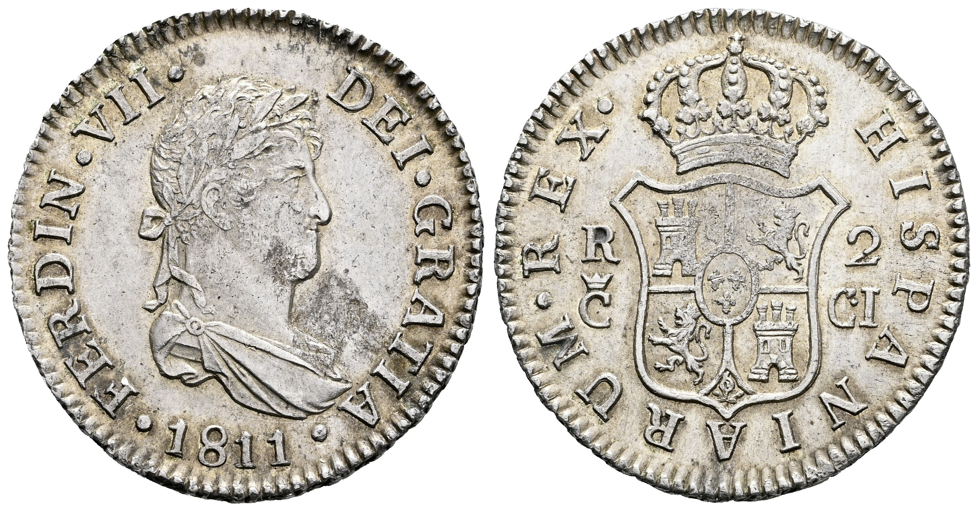 Ferdinand VII (1808-1833). 2 reales. 1811. Cadiz. CI. (Cal-726). Ae. 5,85 g. Large mintmark. Faint scratches. Soft tone. Almost XF/XF. Est...150,00.