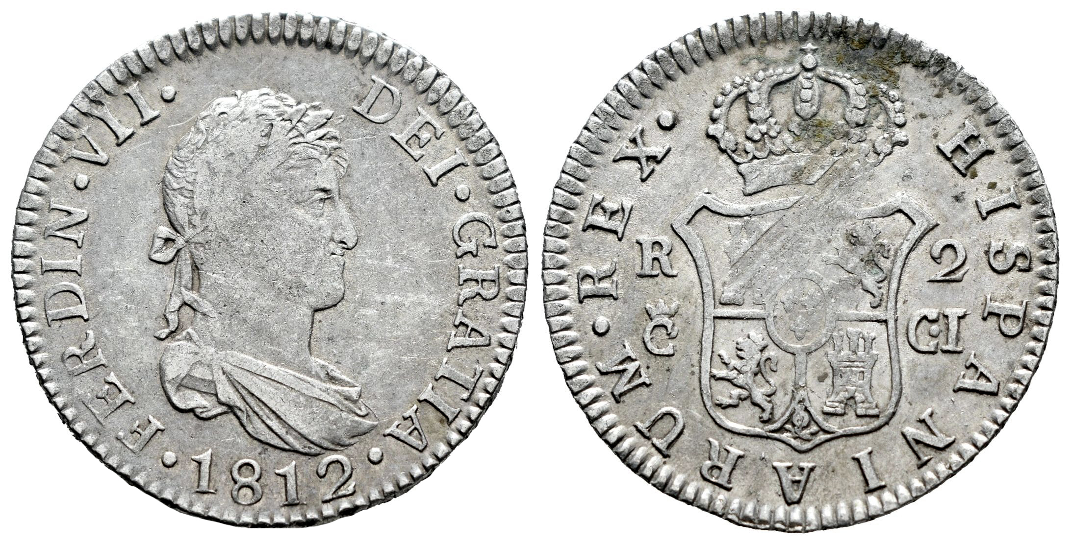 Ferdinand VII (1808-1833). 2 reales. 1812. Cadiz. CI. (Cal-727). Ag. 5,72 g. Slight weak strike. Deposits. VF/Choice VF. Est...60,00.