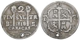 Ferdinand VII (1808-1833). 2 reales. 1819/8. Caracas. BS. (Cal-736). Ag. 4,63 g. Castles and lions. Holed. Rare overdate. VF. Est...150,00.
