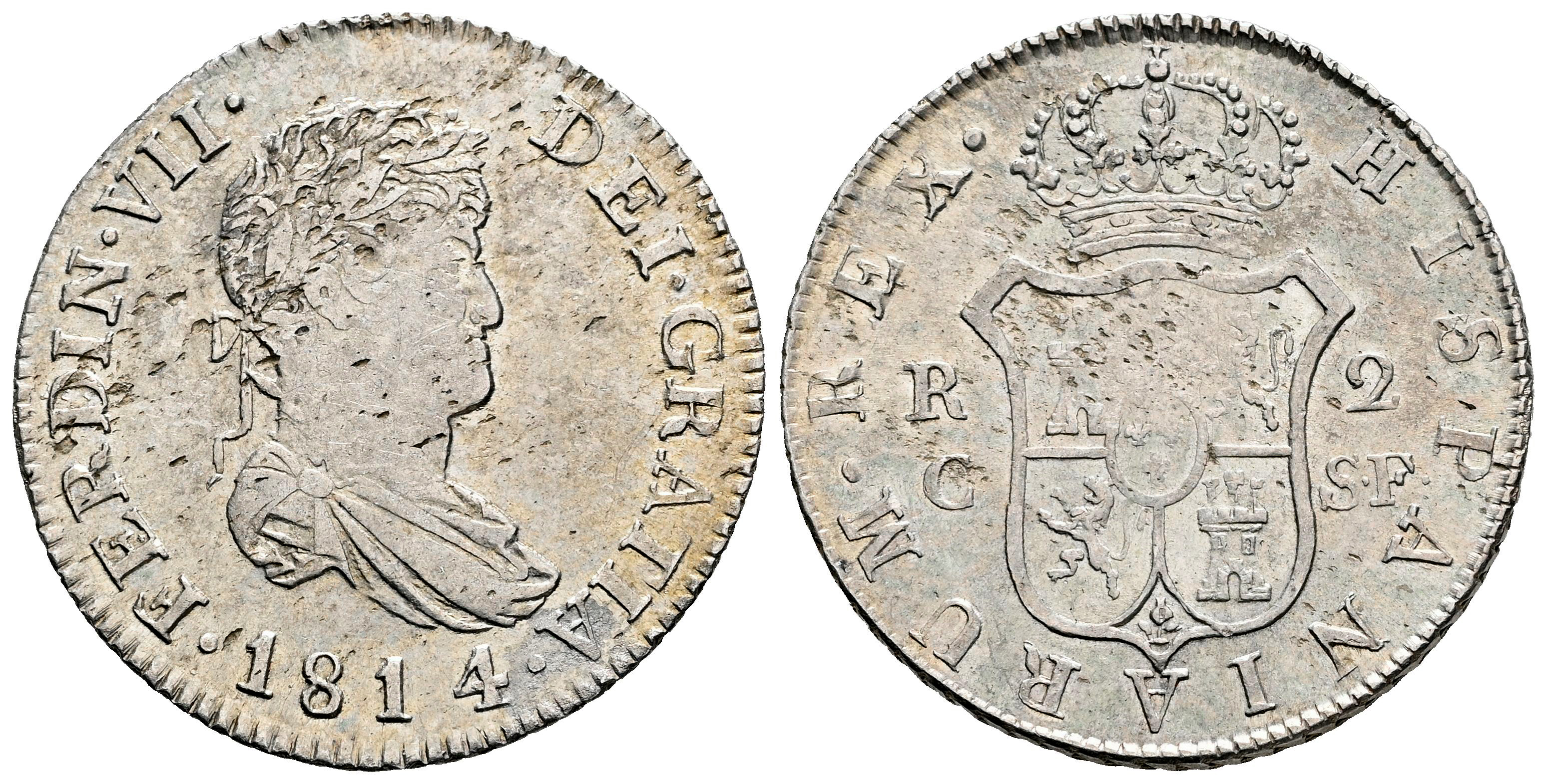 Ferdinand VII (1808-1833). 2 reales. 1814. Cataluña, minted in Mallorca. SF. (Cal-769). Ag. 5,82 g. Minor impurities. Traces of luster. Very scarce in this grade. Almost XF/Choice VF. Est...150,00.
