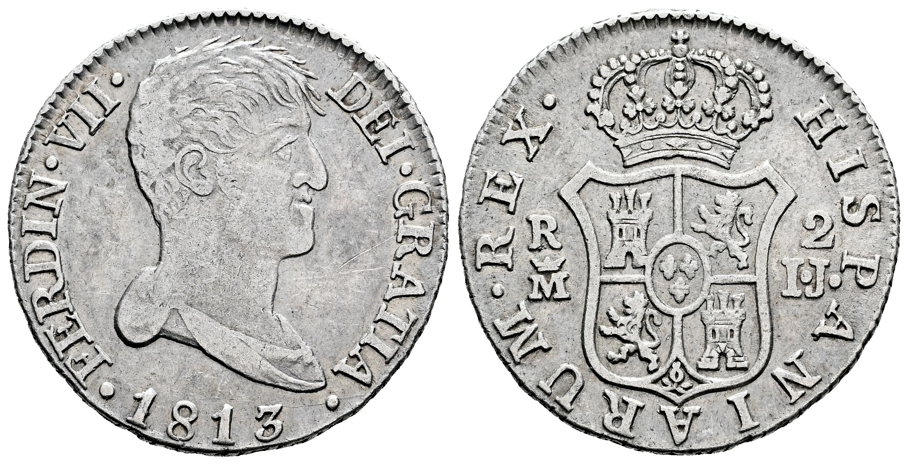 Ferdinand VII (1808-1833). 2 reales. 1813. Madrid. IJ. (Cal-824). Ag. 5,96 g. Bare bust. Almost VF. Est...60,00.