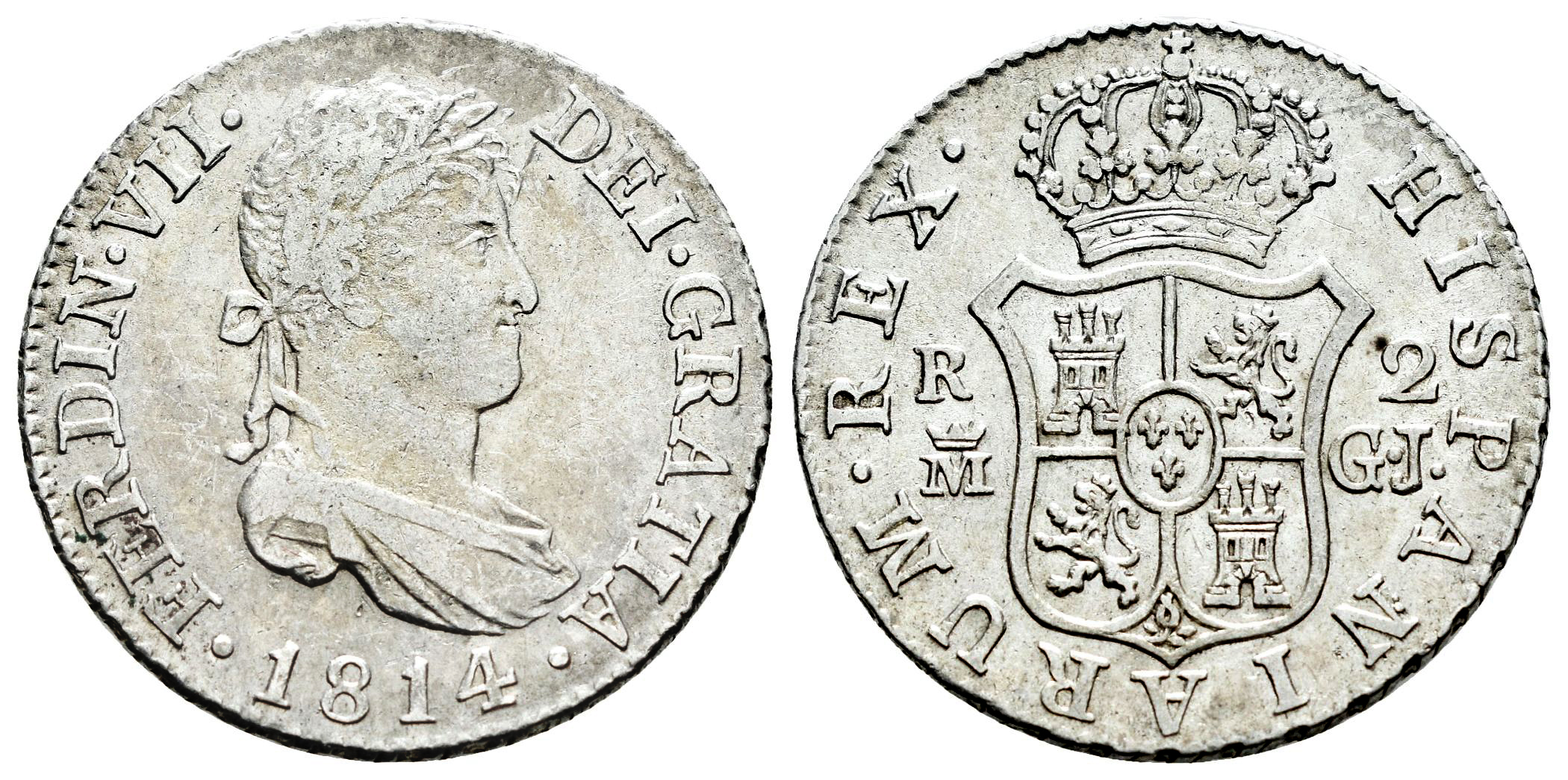 Ferdinand VII (1808-1833). 2 reales. 1814. Madrid. GJ. (Cal-829). Ag. 5,95 g. First-year laureate bust. Slight traces of original luster. Choice VF/Almost XF. Est...120,00.