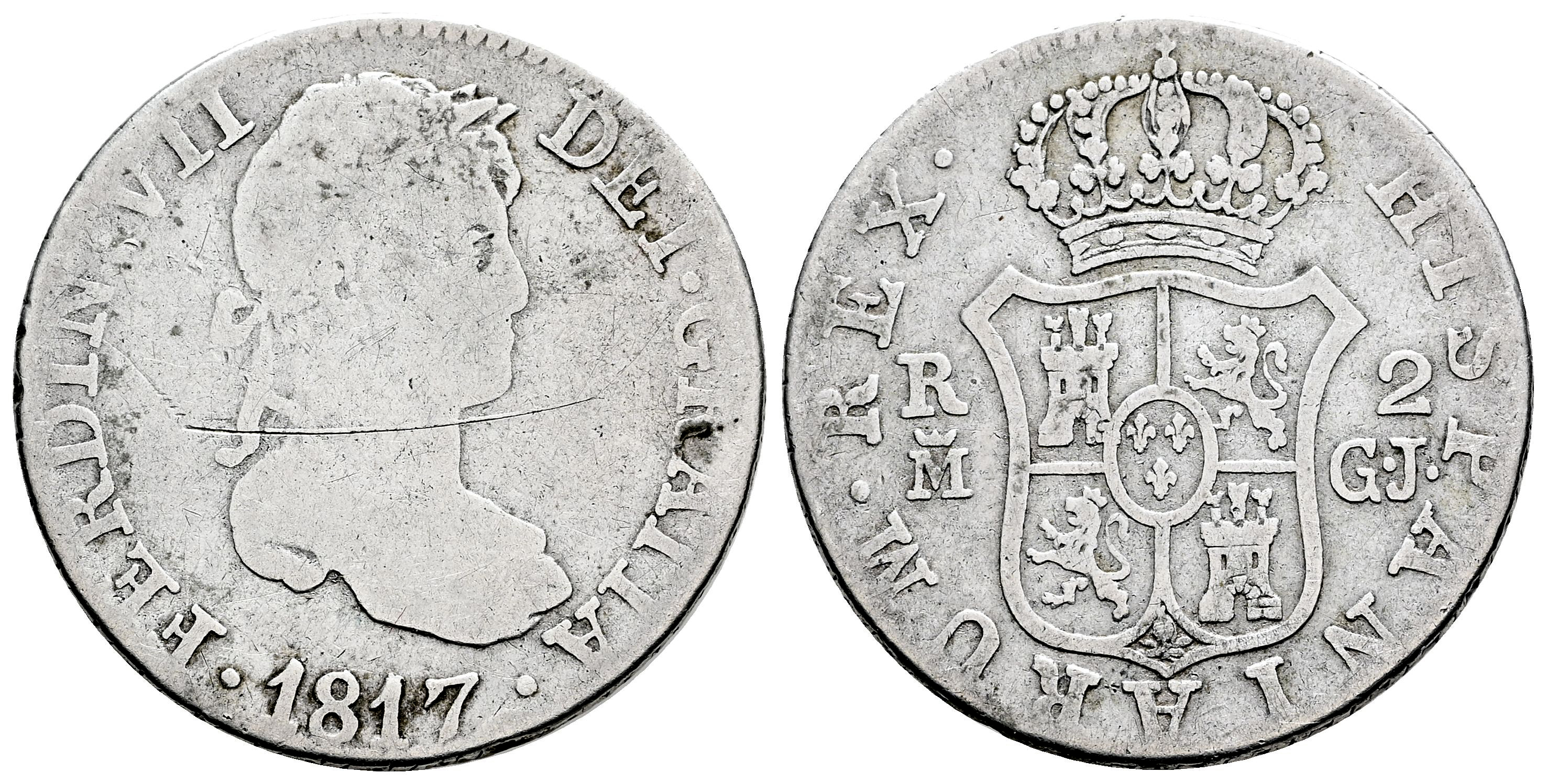 Ferdinand VII (1808-1833). 2 reales. 1817. Madrid. GJ. (Cal-832). Ag. 5,80 g. Scratch on obverse. Rare. Almost F/F. Est...90,00.