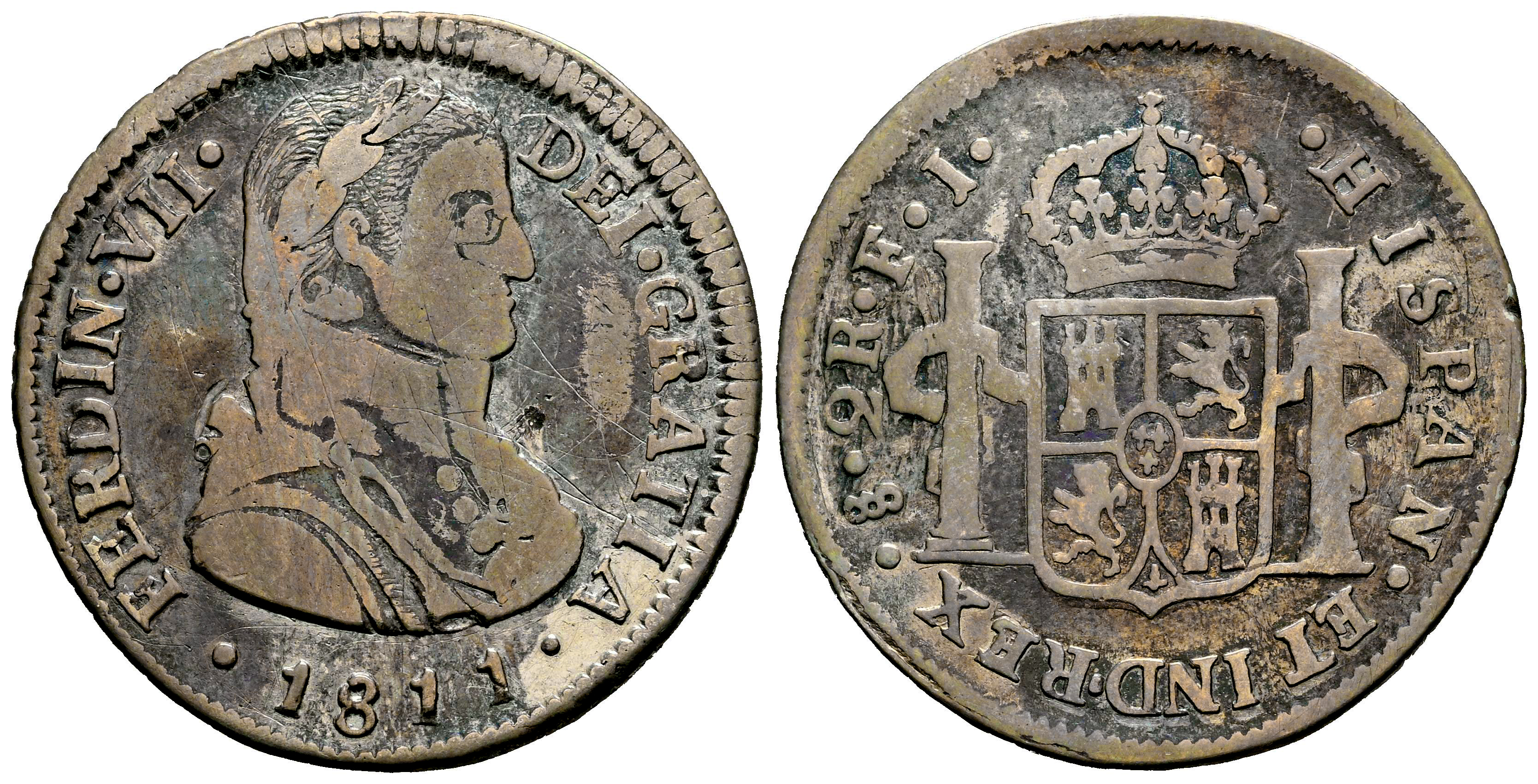 Ferdinand VII (1808-1833). 2 reales. 1811. Santiago. FJ. (Cal-941). Ag. 6,36 g. Cleaned. Scratches on obverse. Traces of welding on obverse. Scarce. F/Choice F. Est...60,00.