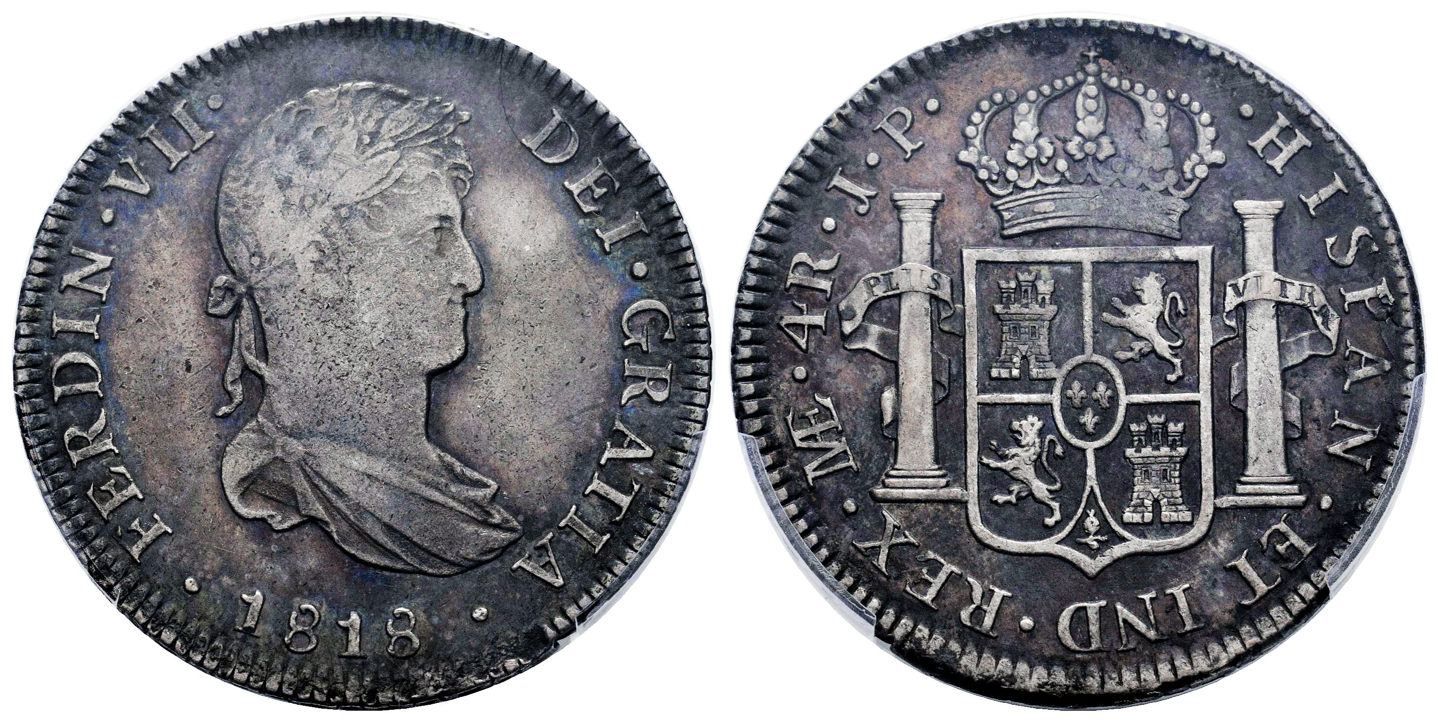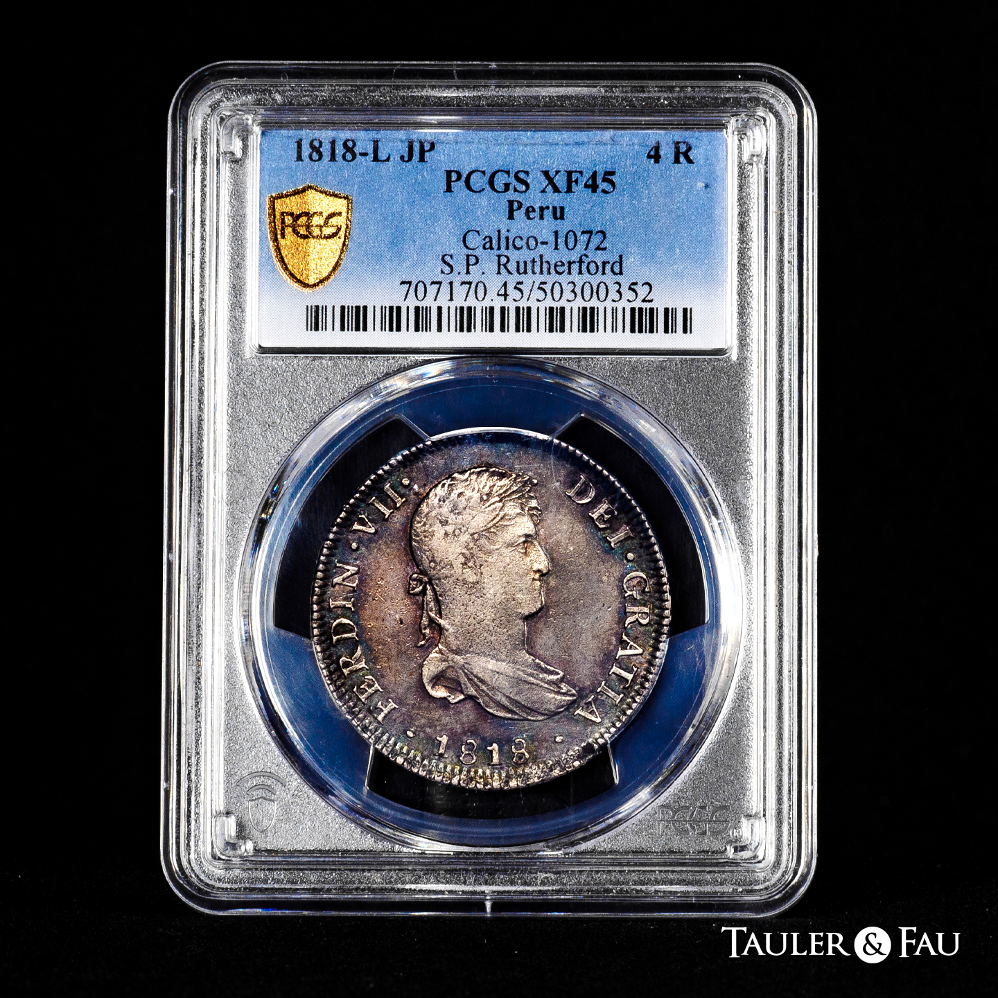 Ferdinand VII (1808-1833). 4 reales. 1818. Lima. JP. (Cal-1072). Ag. Nice old cabinet tone. Rare in this condition. Slabbed by PCGS as XF 45. Only 1 finer specimen in the PCGS census. Ex S.P. Rutherford Collection. Est...350,00.