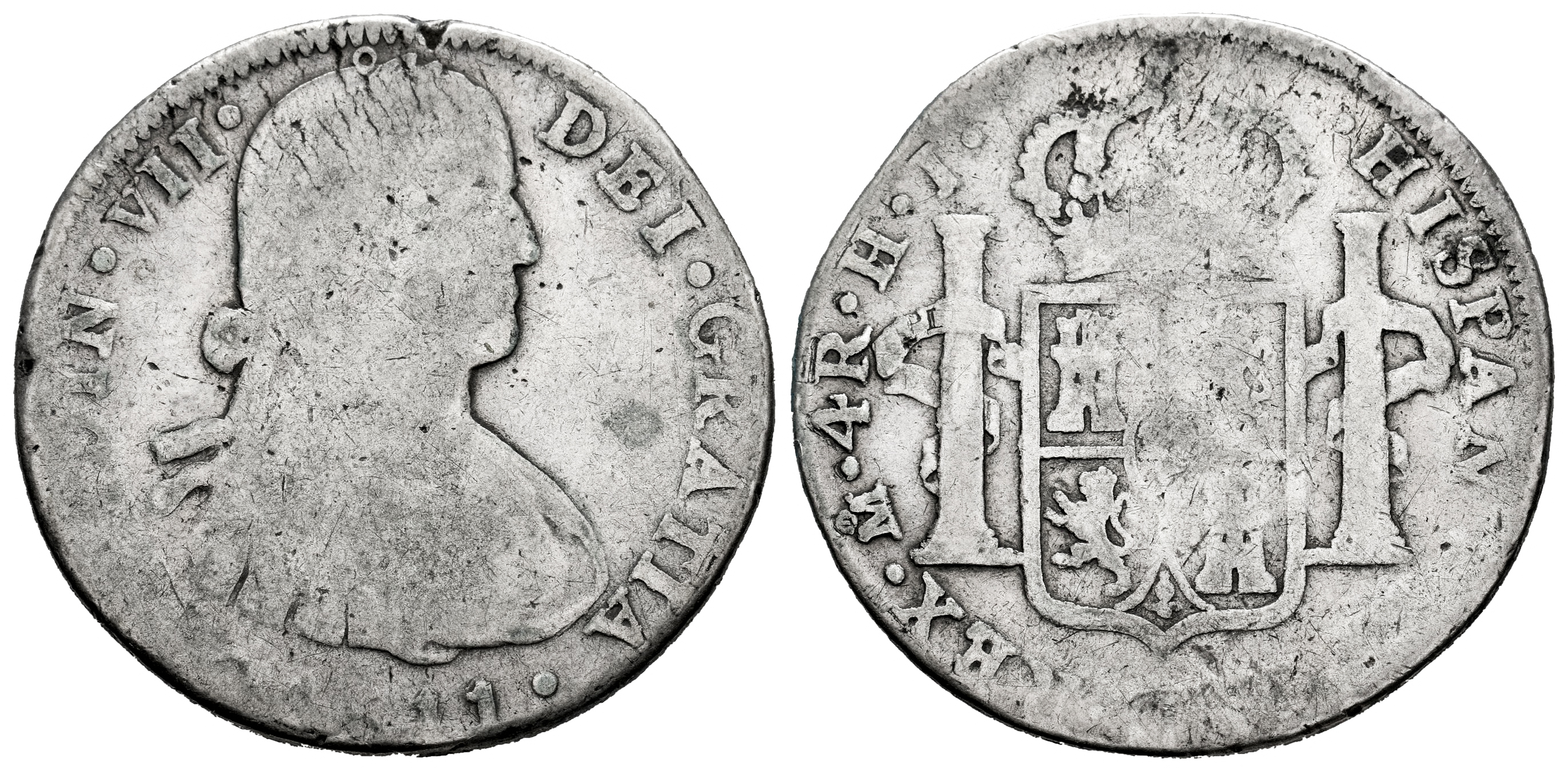 Ferdinand VII (1808-1833). 4 reales. 1811. Mexico. HJ. (Cal-1091). Ag. 12,73 g. Busto imaginario. Intento de perforación en anverso. Rara. F. Est...100,00.