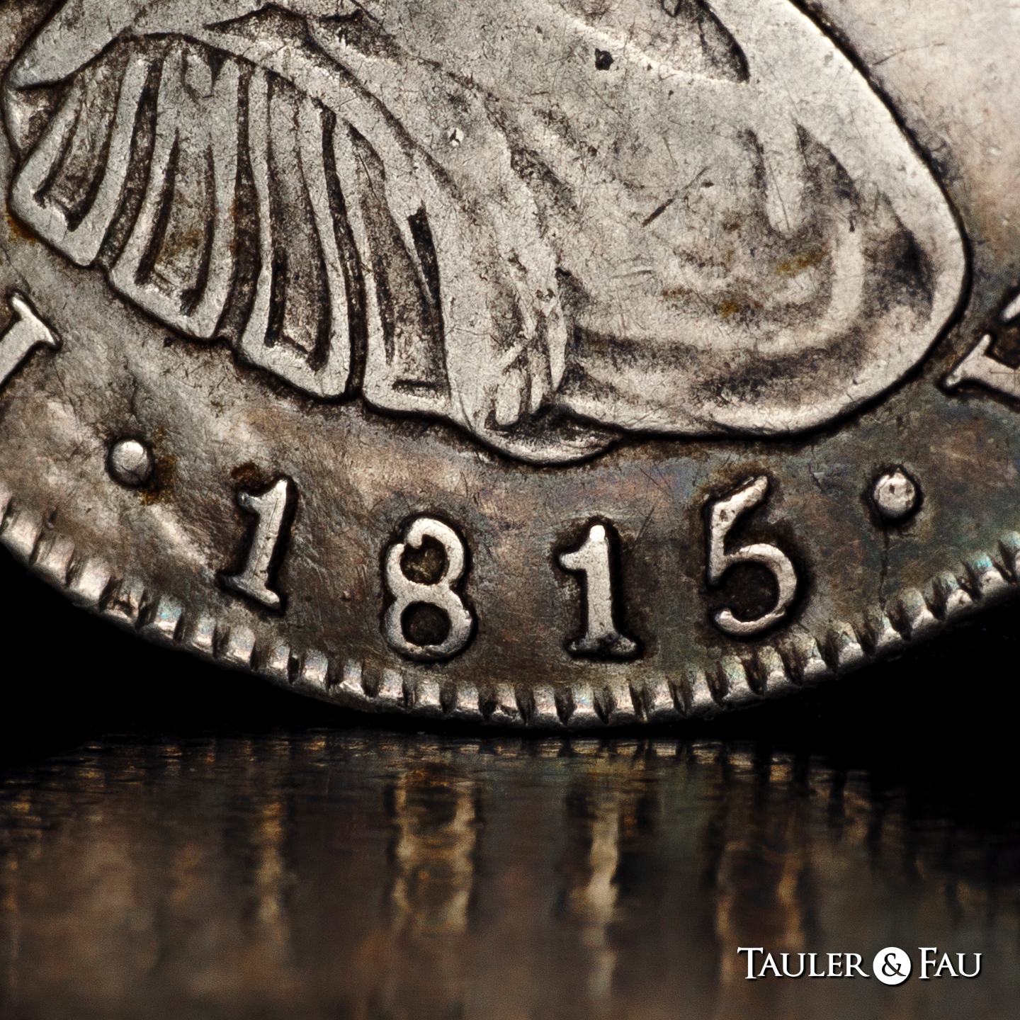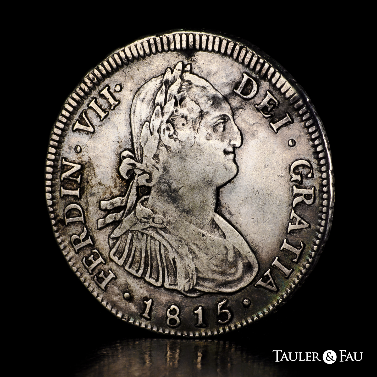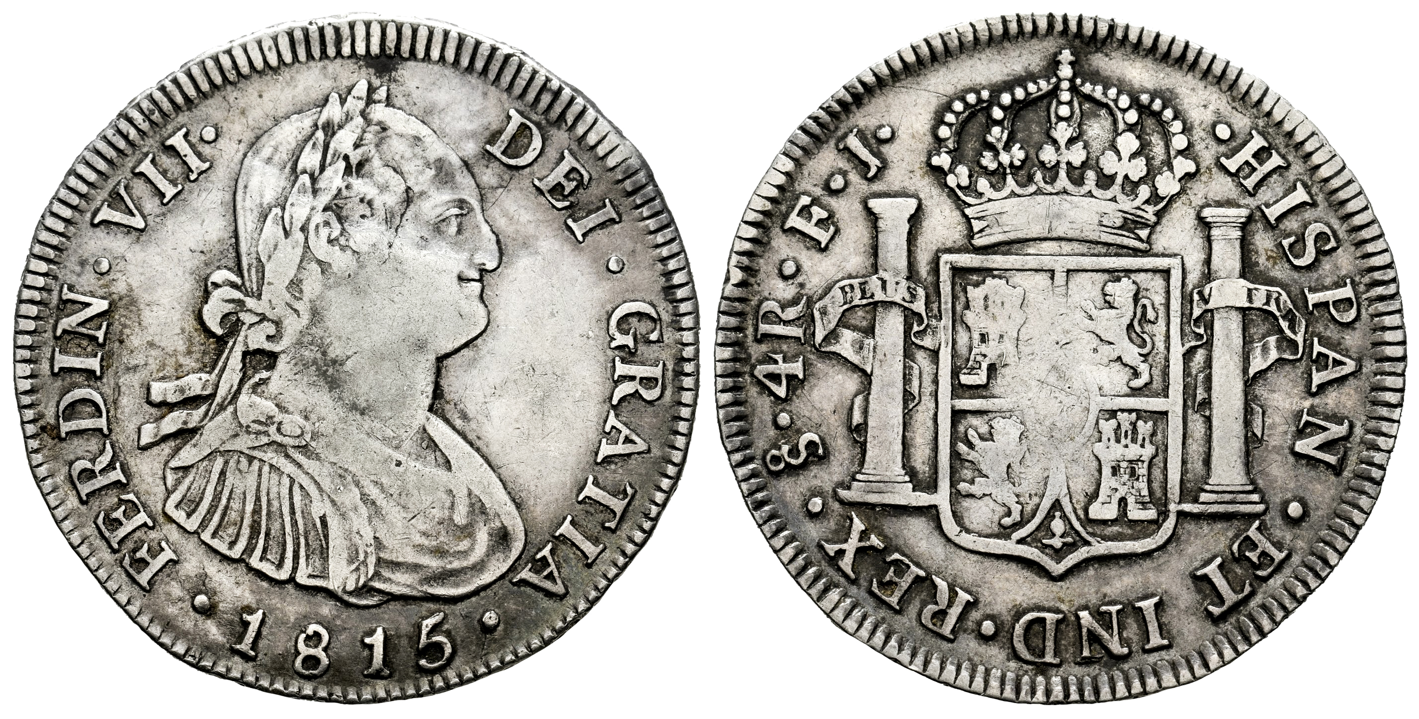 Ferdinand VII (1808-1833). 4 reales. 1815. Santiago. FJ. (Cal-1124). (Km-67). Ag. 13,33 g. Bust of Charles IV. Metal defect on obverse. Only 5 examples in Acsearch and 3 in Coinarchives. Very rare. Choice VF. Est...600,00.