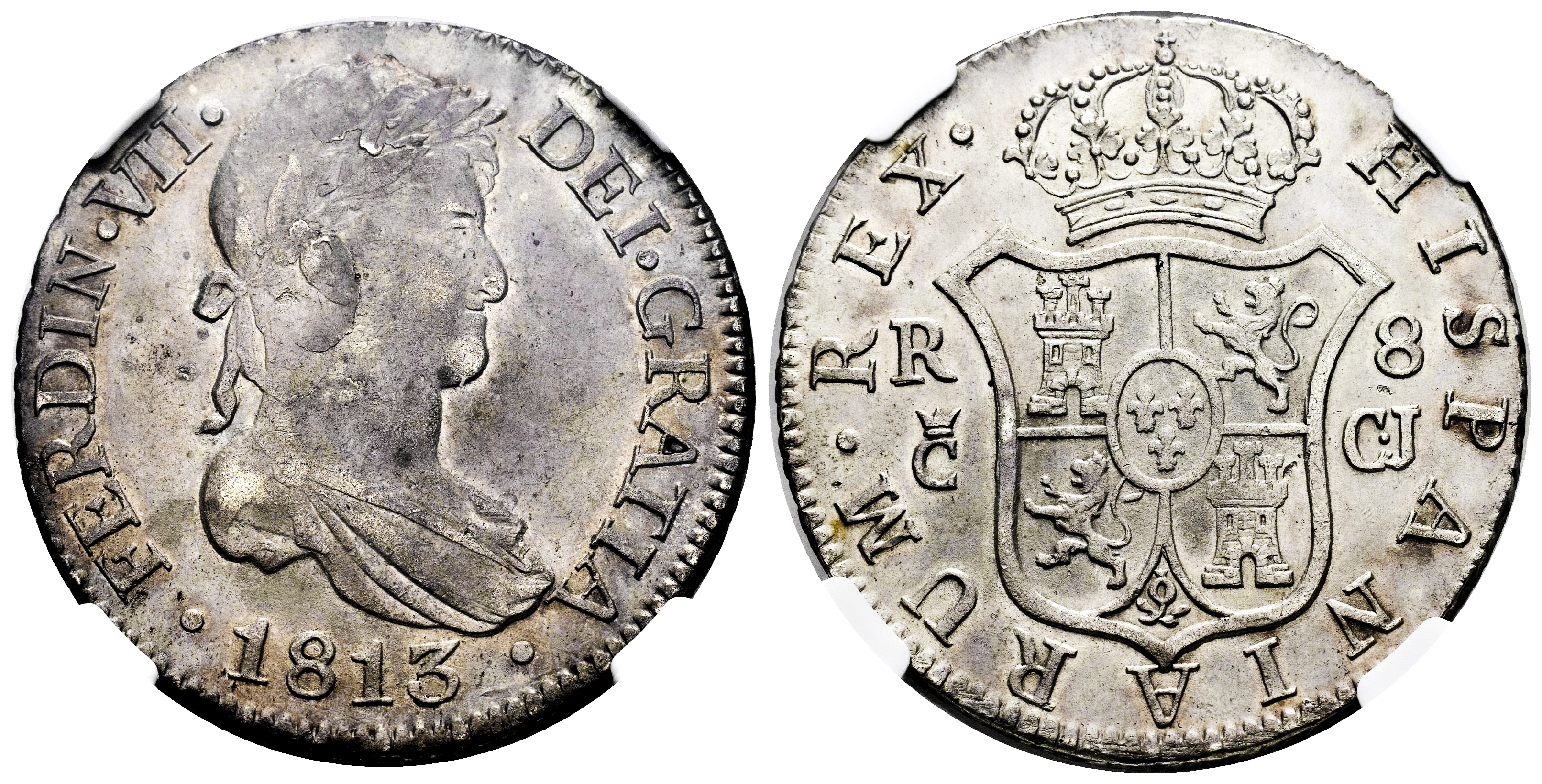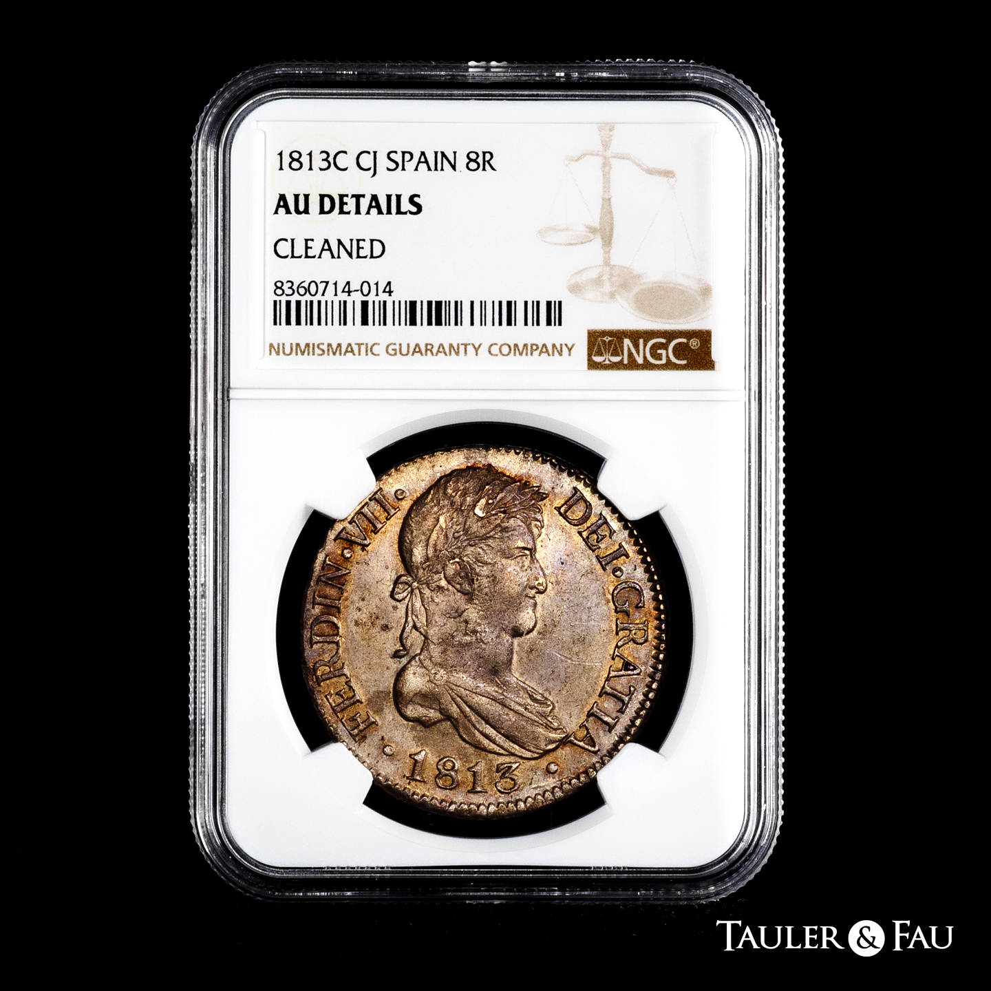 Ferdinand VII (1808-1833). 8 reales. 1813. Cadiz. CJ. (Cal-1153). Ag. Patina. Planchet flaw in the head and minor scratches. Slabbed by NGC as AU Details, Cleaned. Est...450,00.