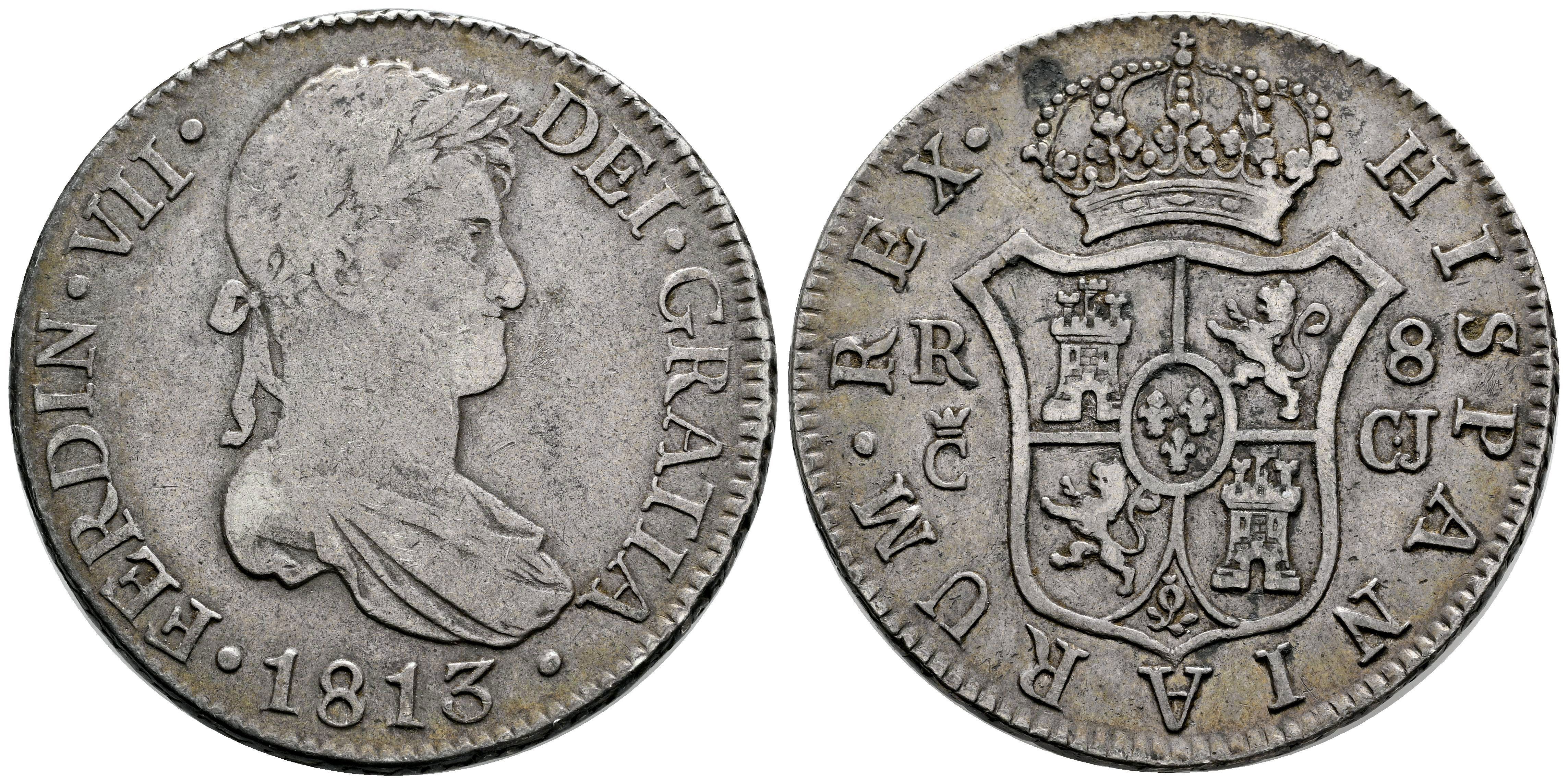 Ferdinand VII (1808-1833). 8 reales. 1813. Cadiz. CJ. (Cal-1153). Ag. 26,82 g. Lightly toned. Almost VF. Est...250,00.