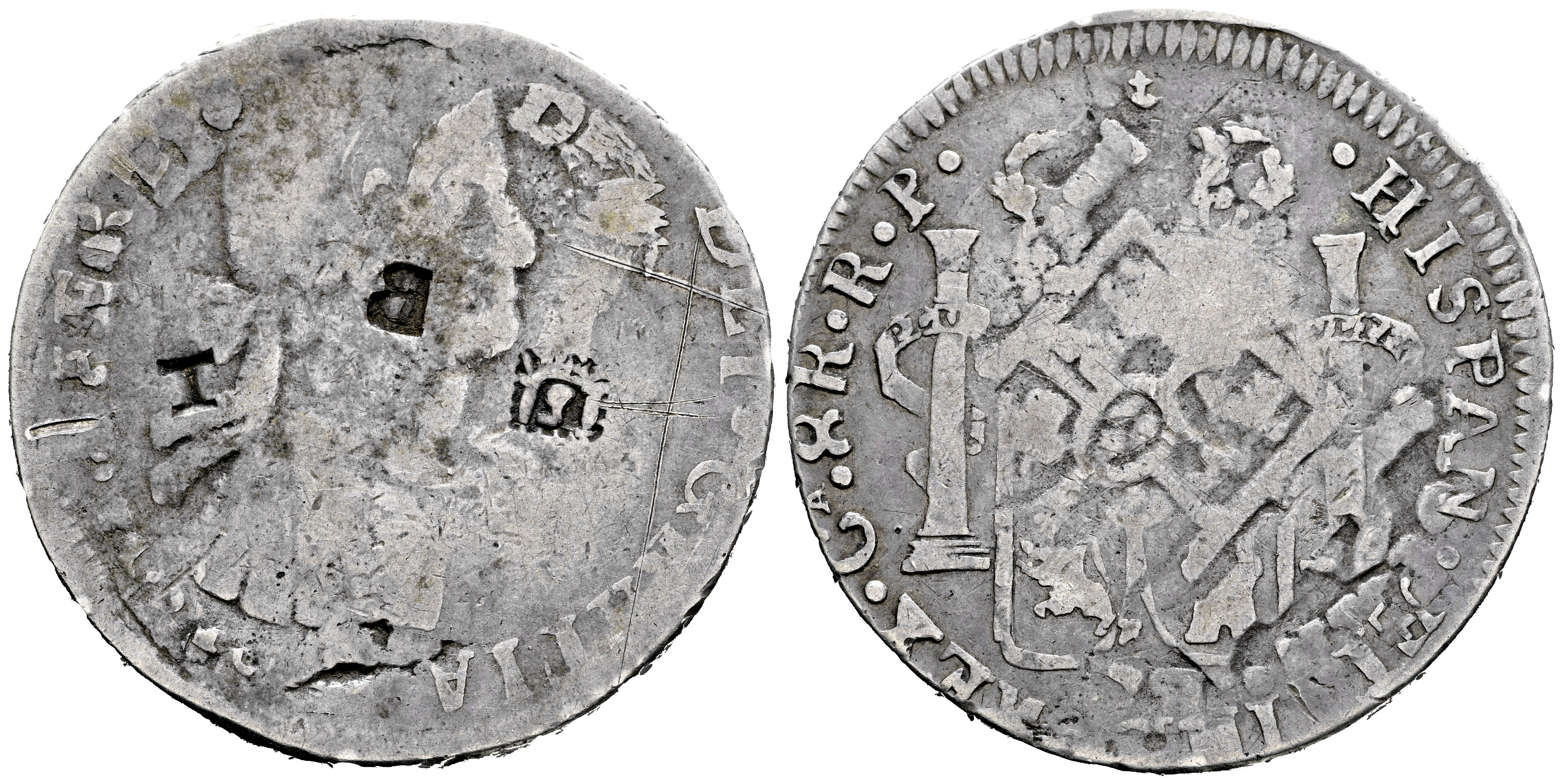 Ferdinand VII (1808-1833). 8 reales. (1811-13). Chihuahua. RP. (Cal-Tipo 286). Ag. 26,15 g. Countermarks "T" "B" and columns of Hercules with crowned pomegranate. Imaginary bust. Date not visible. Molten silver. Very rare. F/Choice F. Est...300,00.