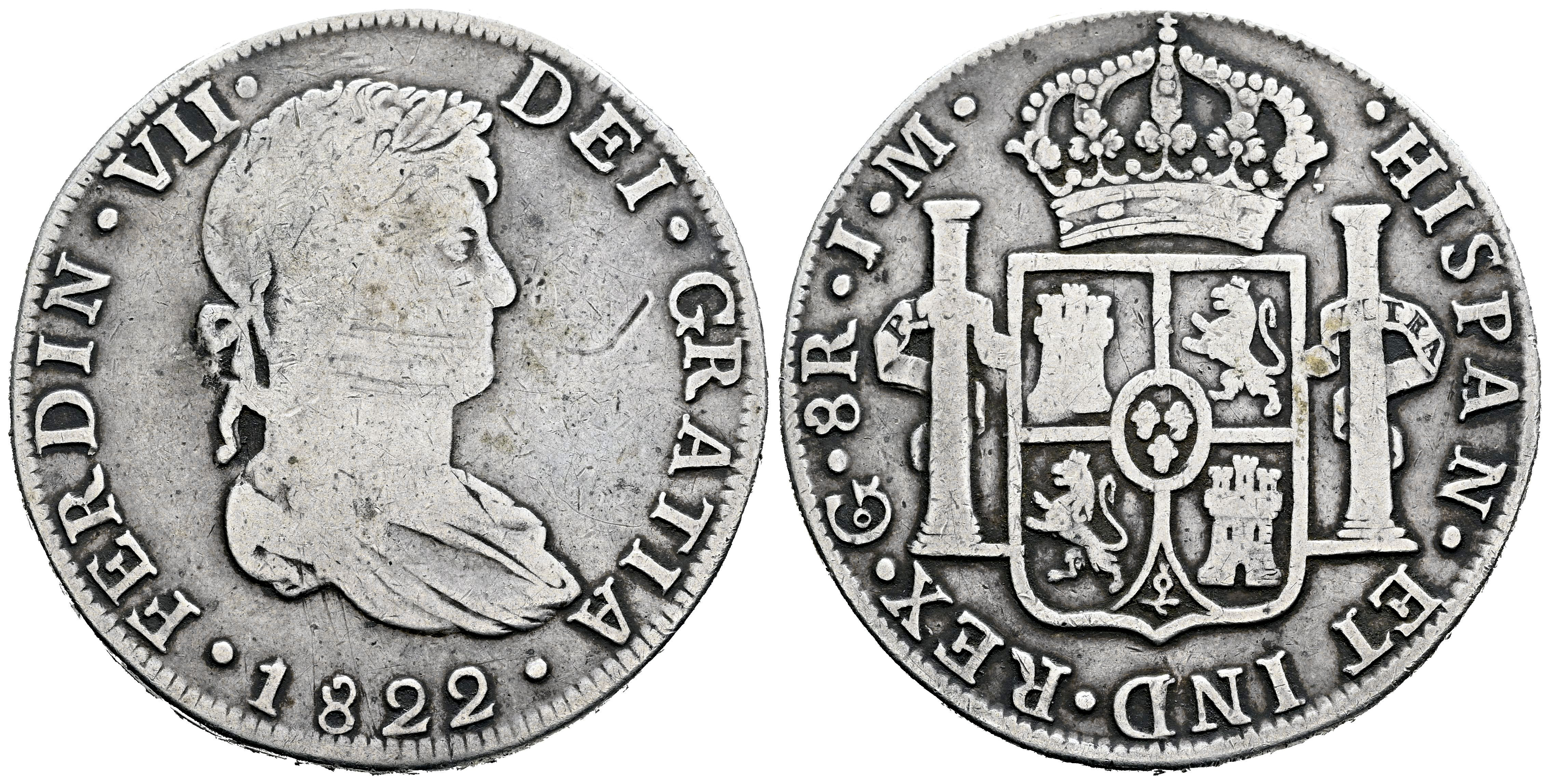 Ferdinand VII (1808-1833). 8 reales. 1822. Guanajuato. JM. (Cal-1218). Ag. 26,30 g. Scarce. Choice F. Est...180,00.
