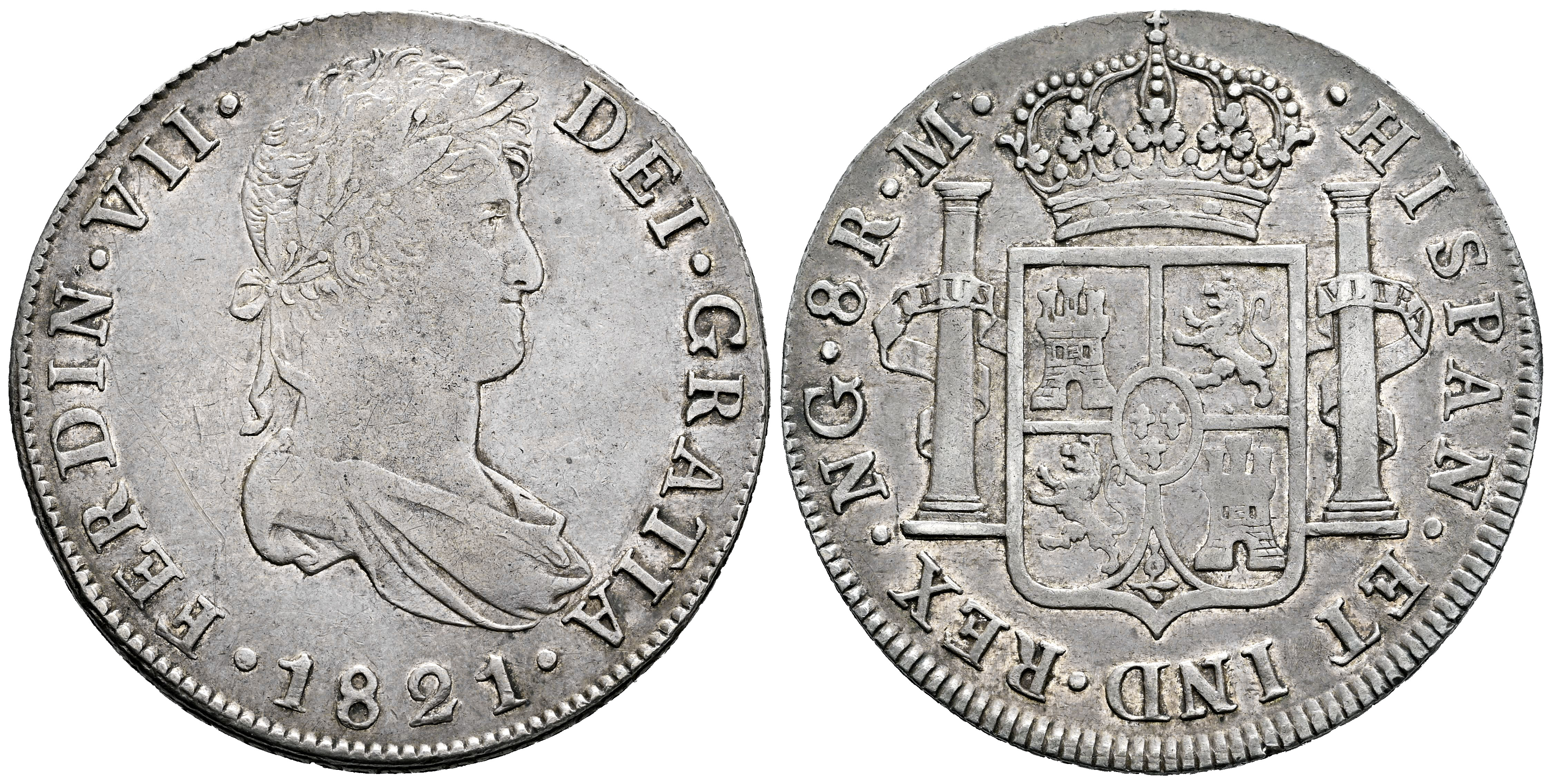 Ferdinand VII (1808-1833). 8 reales. 1821. Guatemala. M. (Cal-1236). Ag. 27,00 g. Weak strike. Patina. Choice VF. Est...150,00.