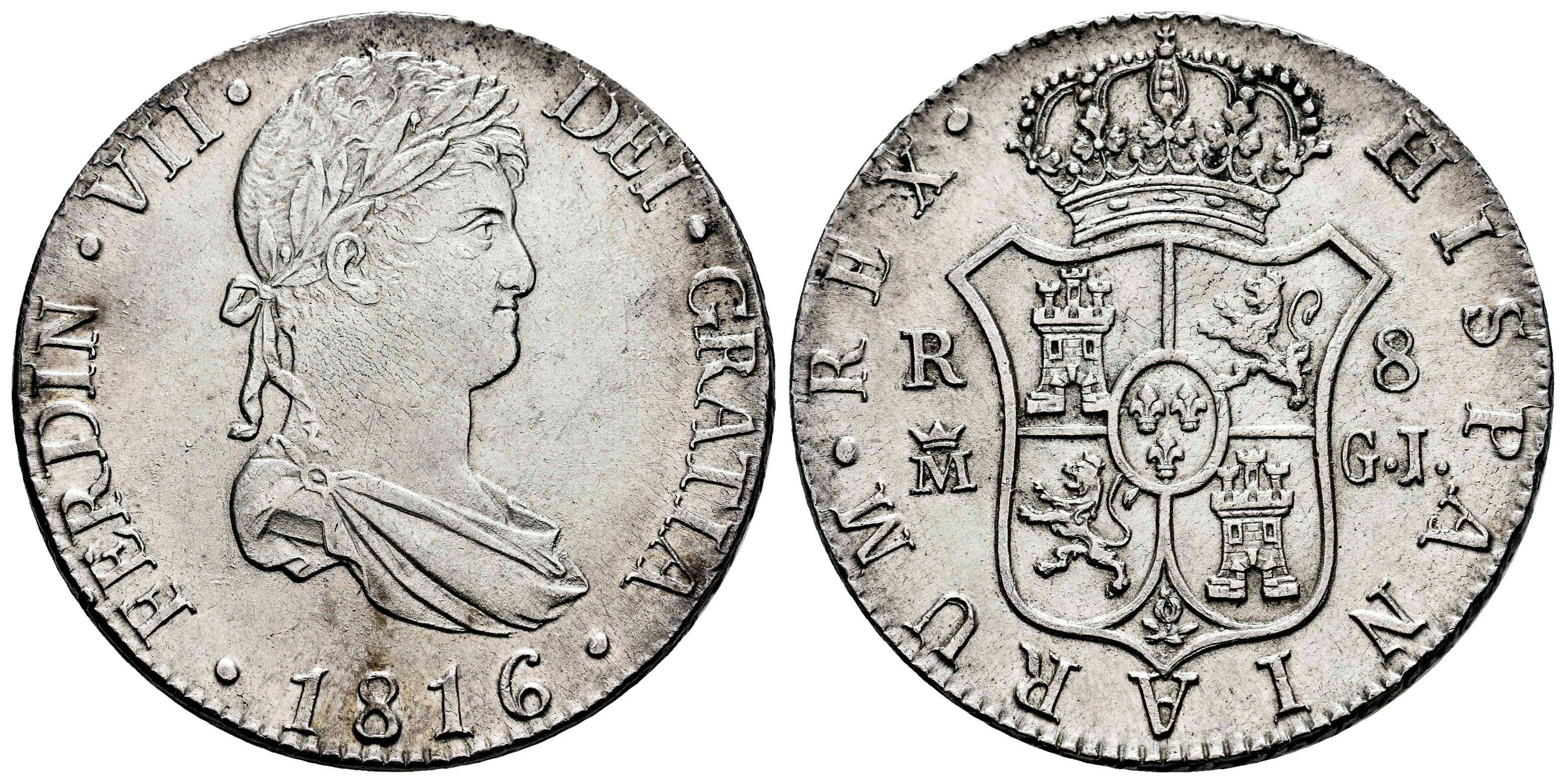 Ferdinand VII (1808-1833). 8 reales. 1816. Madrid. GJ. (Cal-1270). Ag. 26,99 g. Minimal surface hairlines, otherwise very good struck. Scarce. XF. Est...450,00.