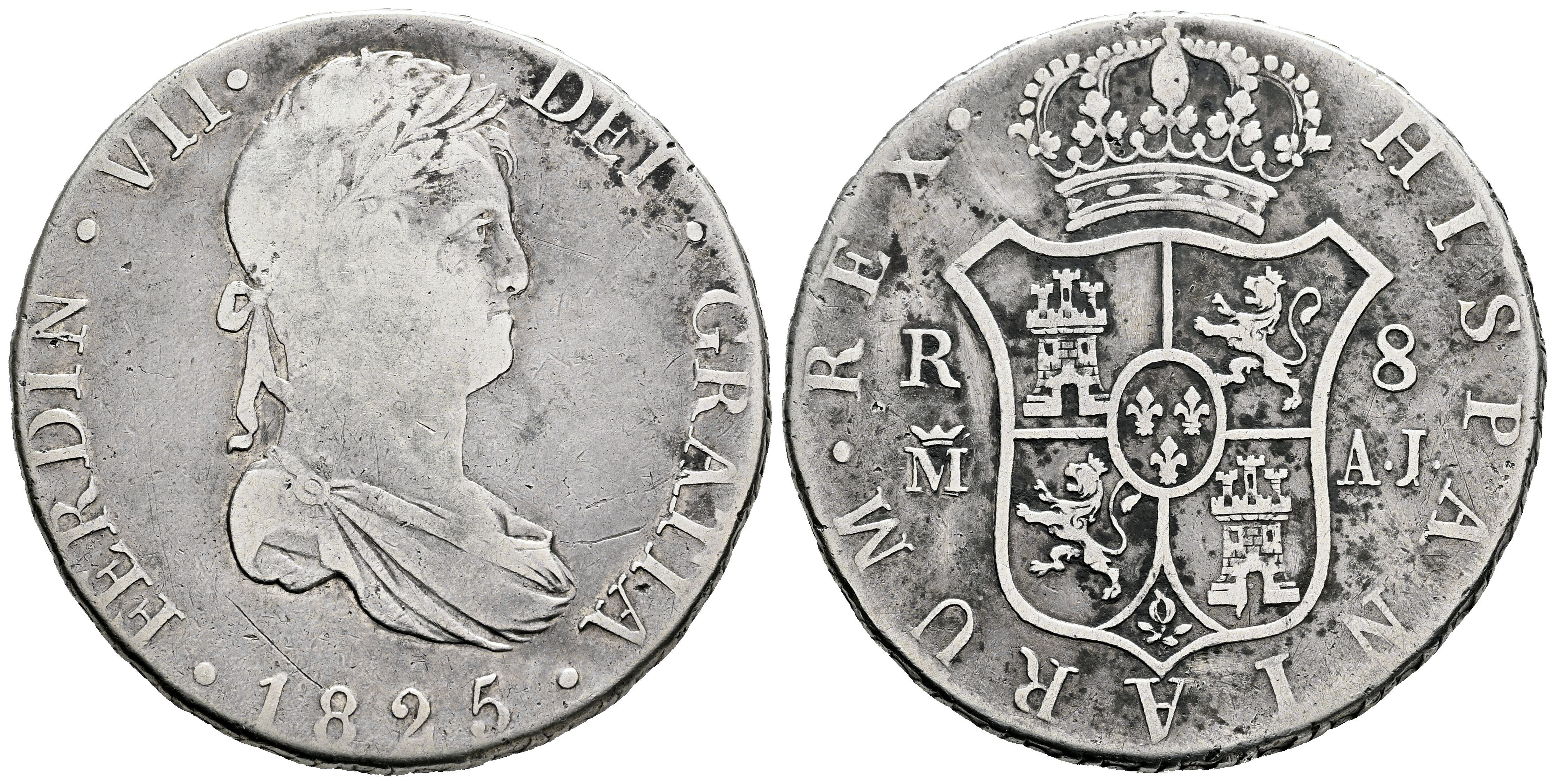 Ferdinand VII (1808-1833). 8 reales. 1825. Madrid. AJ. (Cal-1279). Ag. 26,56 g. Cleaned. Scratches. Very rare, a few specimens known. Ex Tauler&Fau 110 (23/05/2022), lot 5176. F/Choice F. Est...450,00.