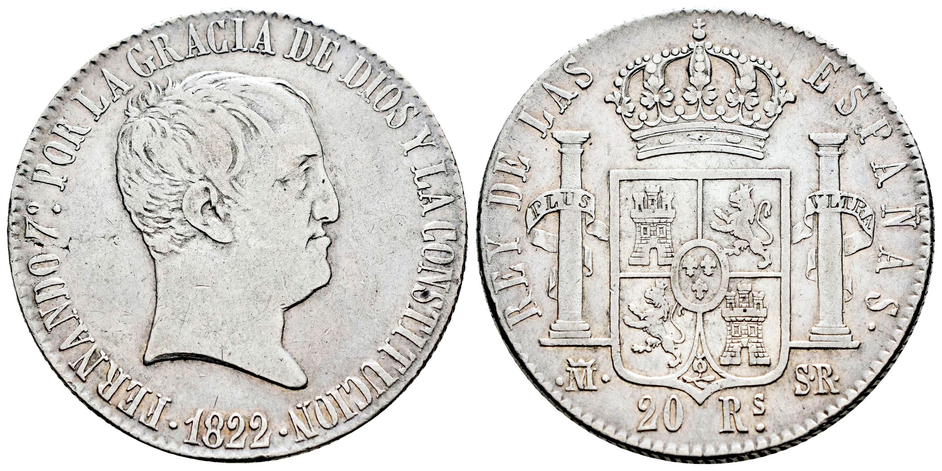 Ferdinand VII (1808-1833). 20 reales. 1822. Madrid. SR. (Cal-1282). Ag. 26,75 g. "Cabezon" type. Scarce. Almost VF. Est...250,00.