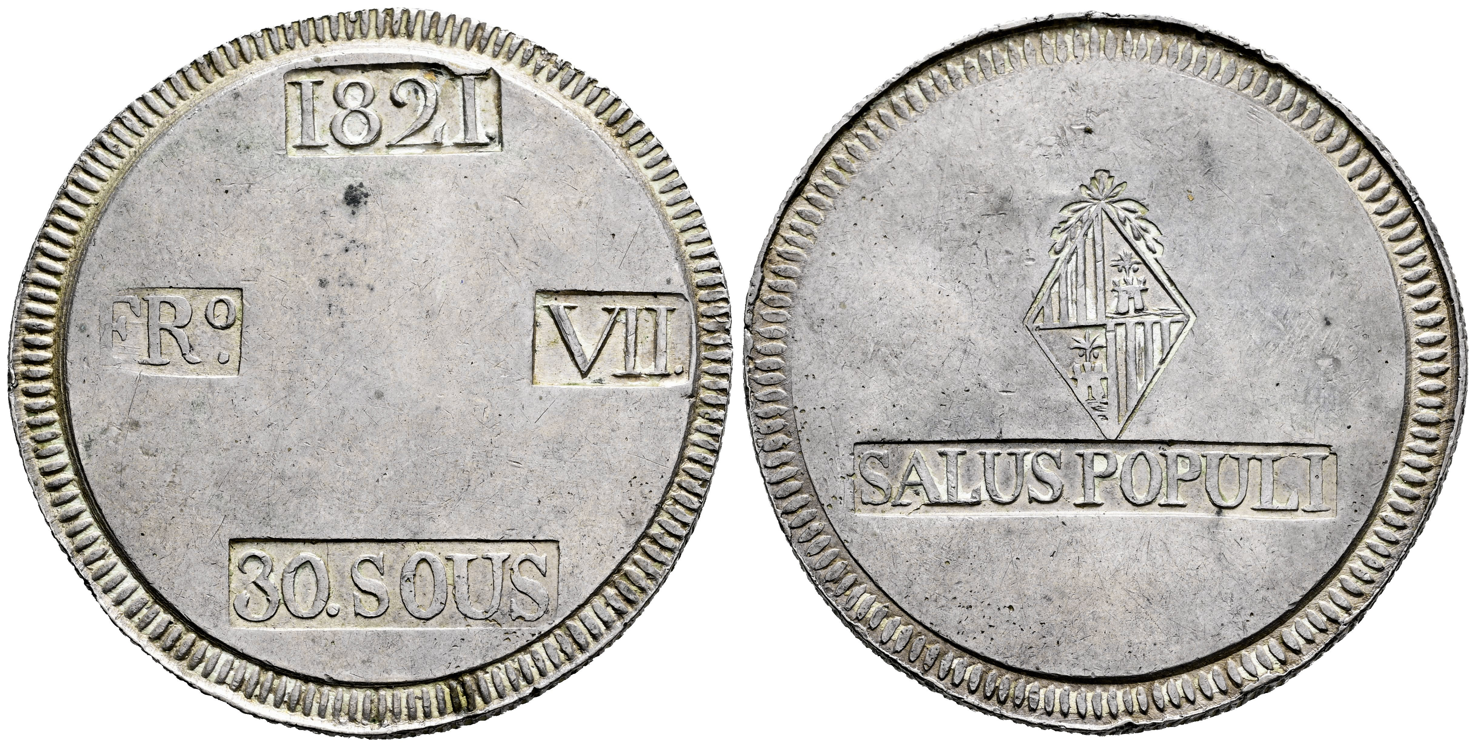Ferdinand VII (1808-1833). 30 sous. 1821. Mallorca. (Cal-1293). Ag. 26,87 g. Scarce in this grade. Almost XF. Est...300,00.