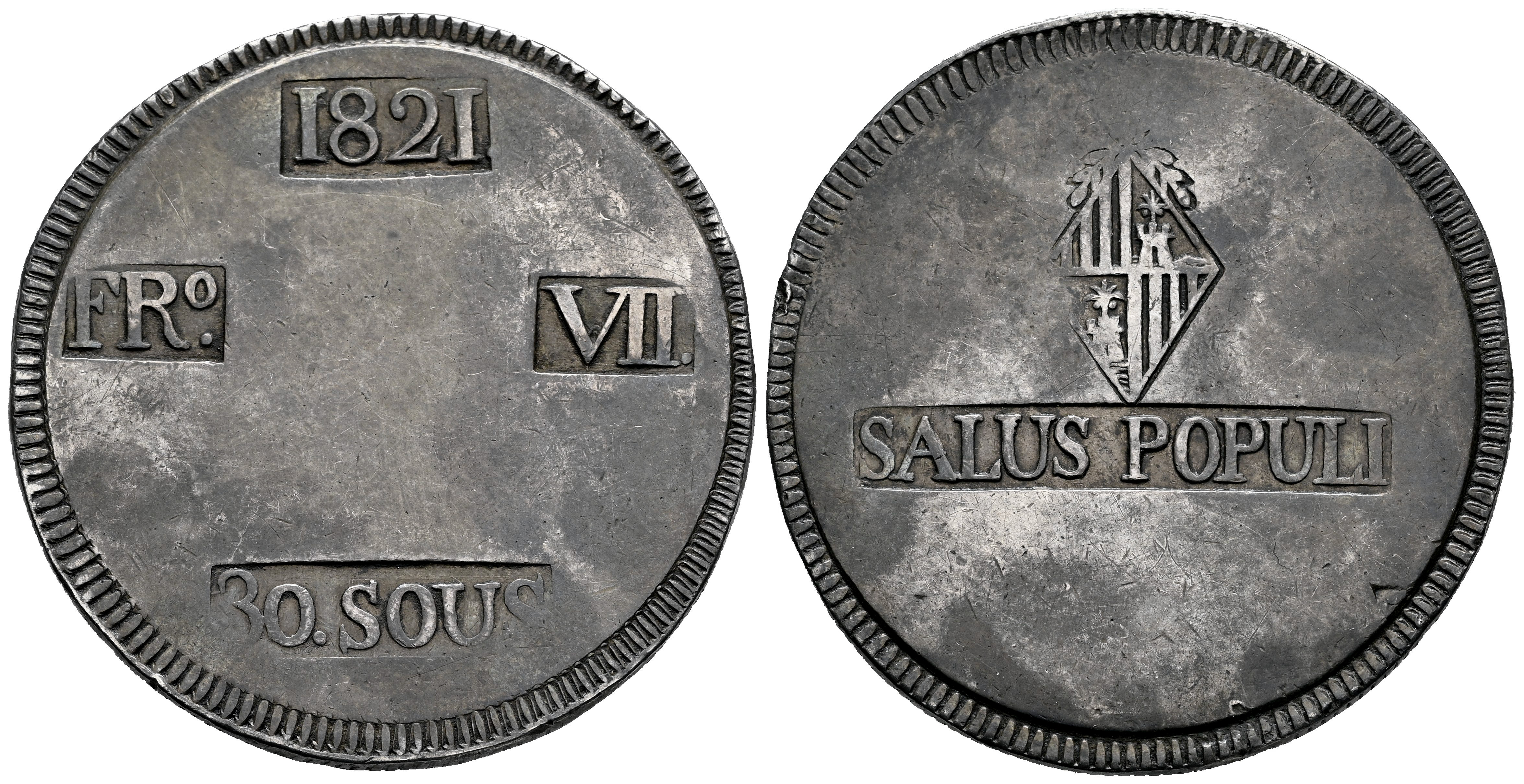 Ferdinand VII (1808-1833). 30 sous. 1821. Mallorca. (Cal-1293). Ag. 26,66 g. Minor nick on edge. Irregular patina. Choice VF. Est...300,00.