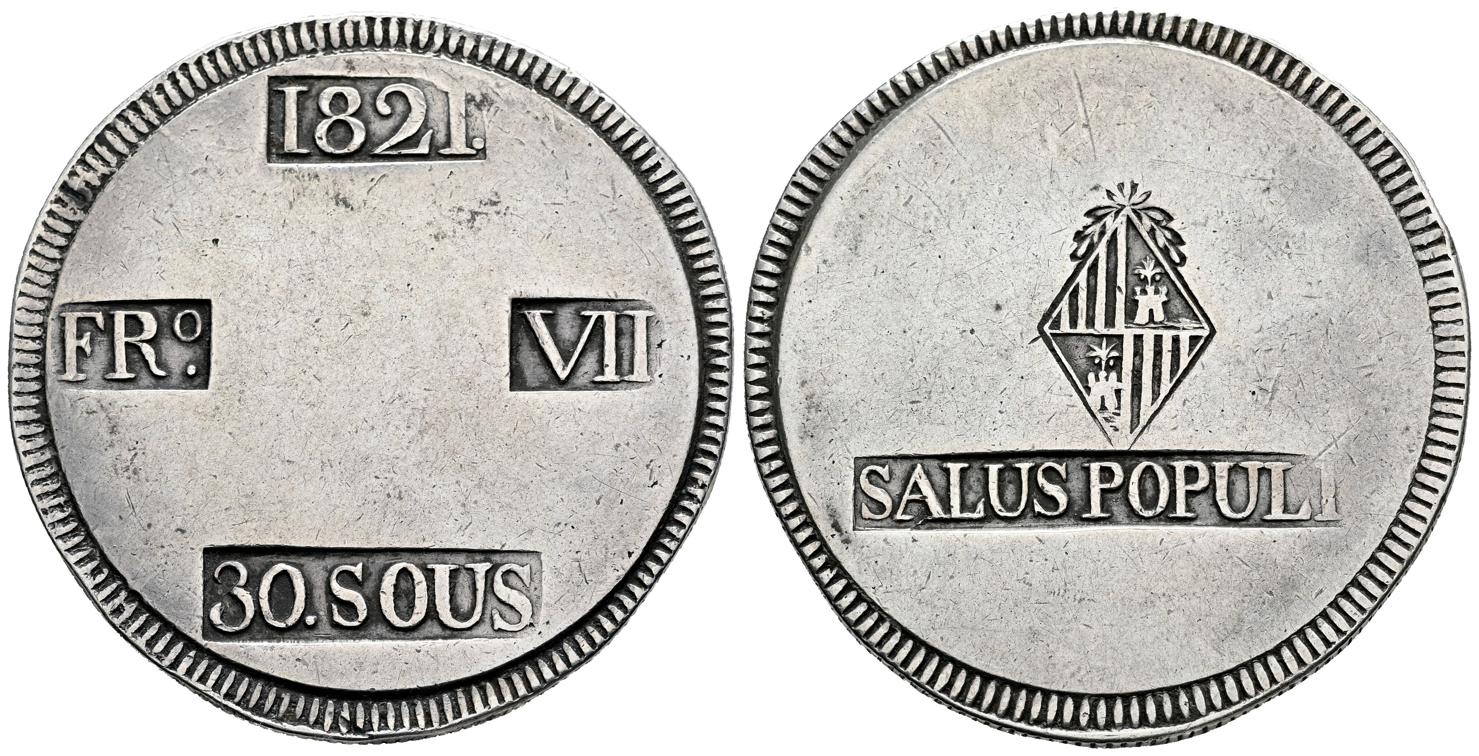 Ferdinand VII (1808-1833). 30 sous. 1821. Mallorca. (Cal-1293). Ag. 26,42 g. Choice VF. Est...300,00.