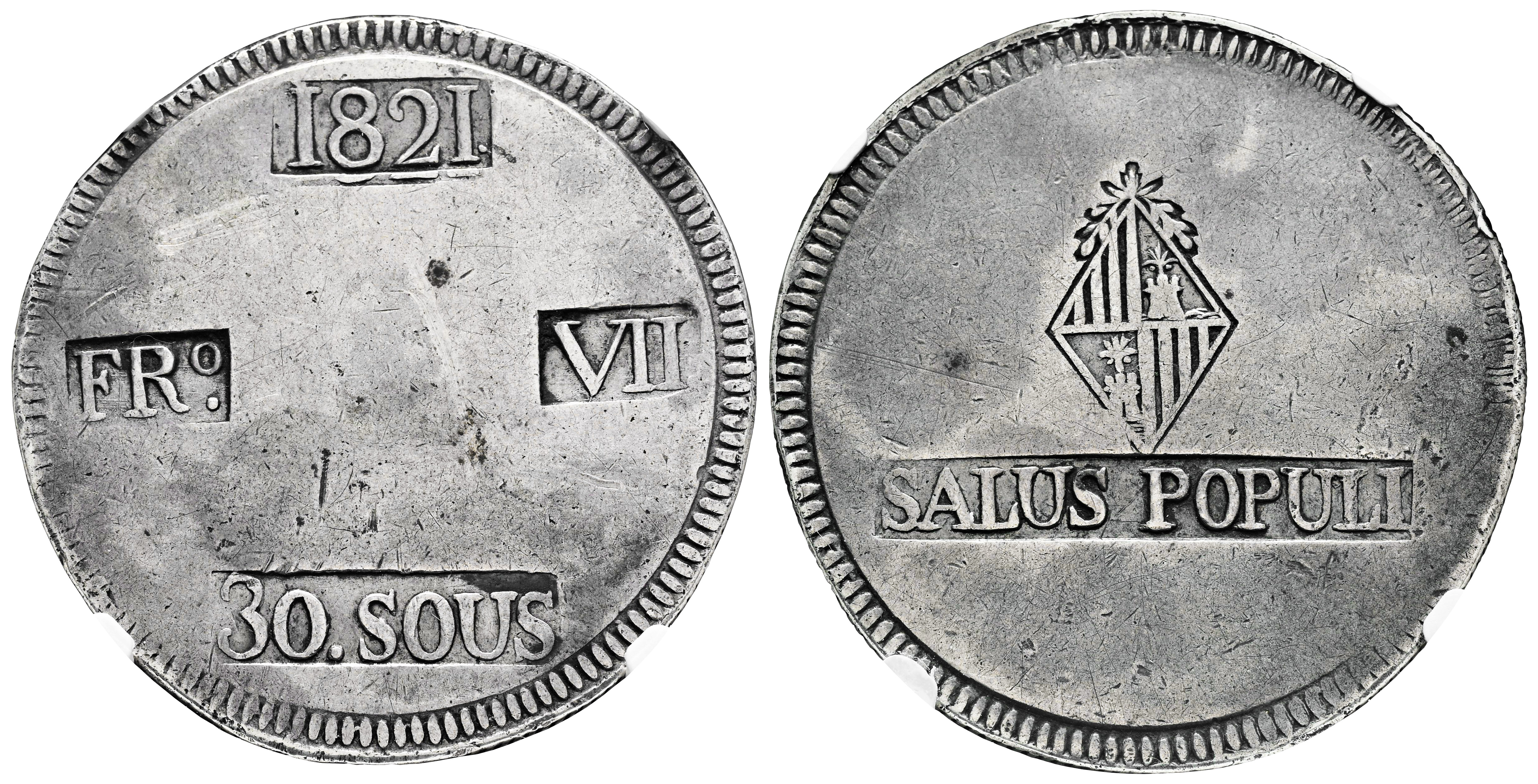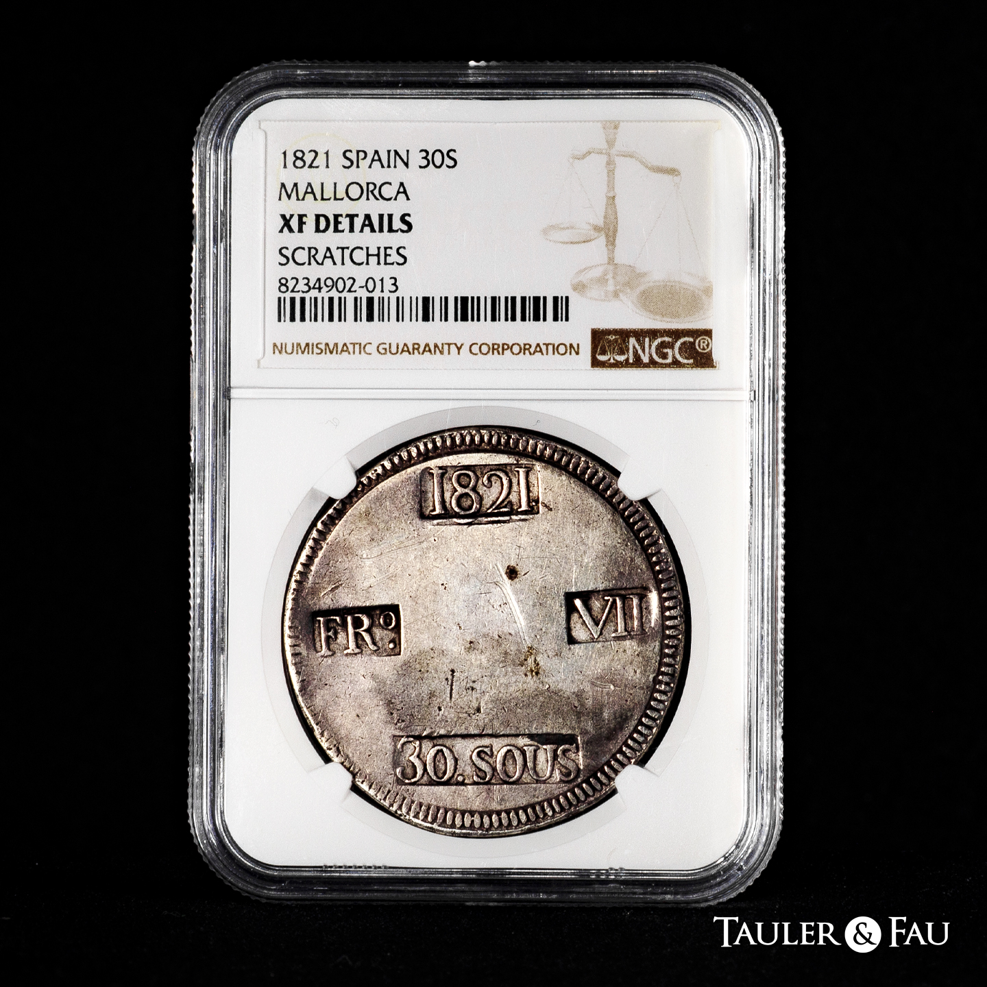 Ferdinand VII (1808-1833). 30 sous. 1821. Mallorca. (Cal-1293). Ag. Slabbed by NGC as XF Details. Scratches. Est...300,00.