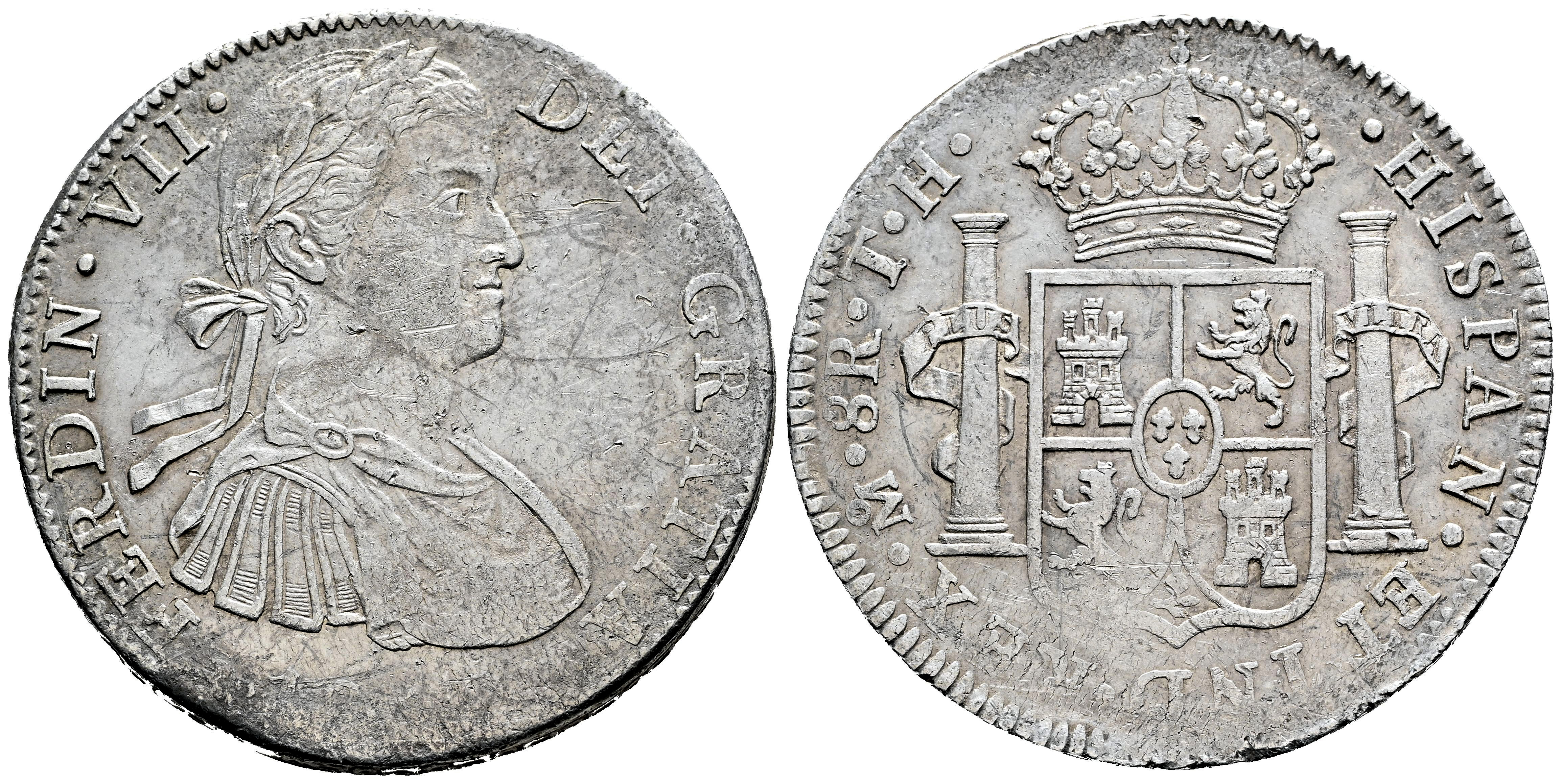 Ferdinand VII (1808-1833). 8 reales. 1809. Mexico. TH. (Cal-1308). Ag. 26,72 g. Imaginary bust. Faint scratches. Weak strike. Choice VF. Est...200,00.