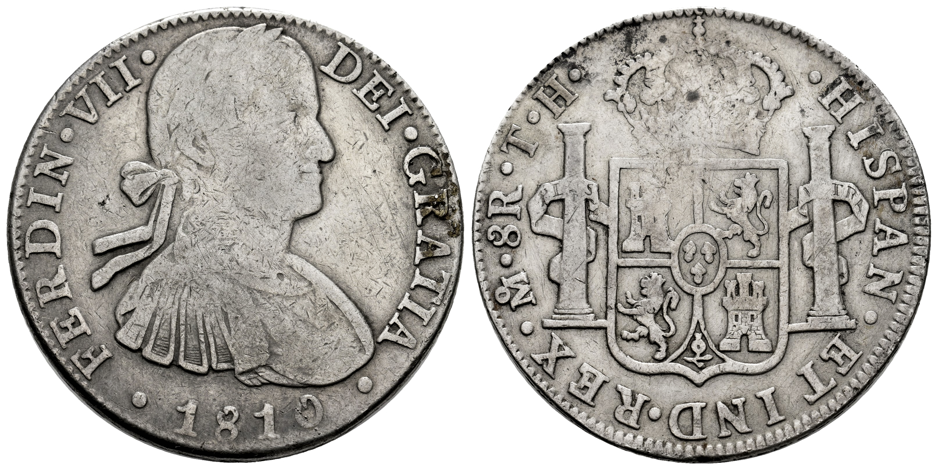 Ferdinand VII (1808-1833). 8 reales. 1810. Mexico. TH. (Cal-1312). Ag. 26,48 g. Imaginary bust. Rare. Ex Martí Hervera (21-22/03/2000), lot 2427. Choice F. Est...150,00.
