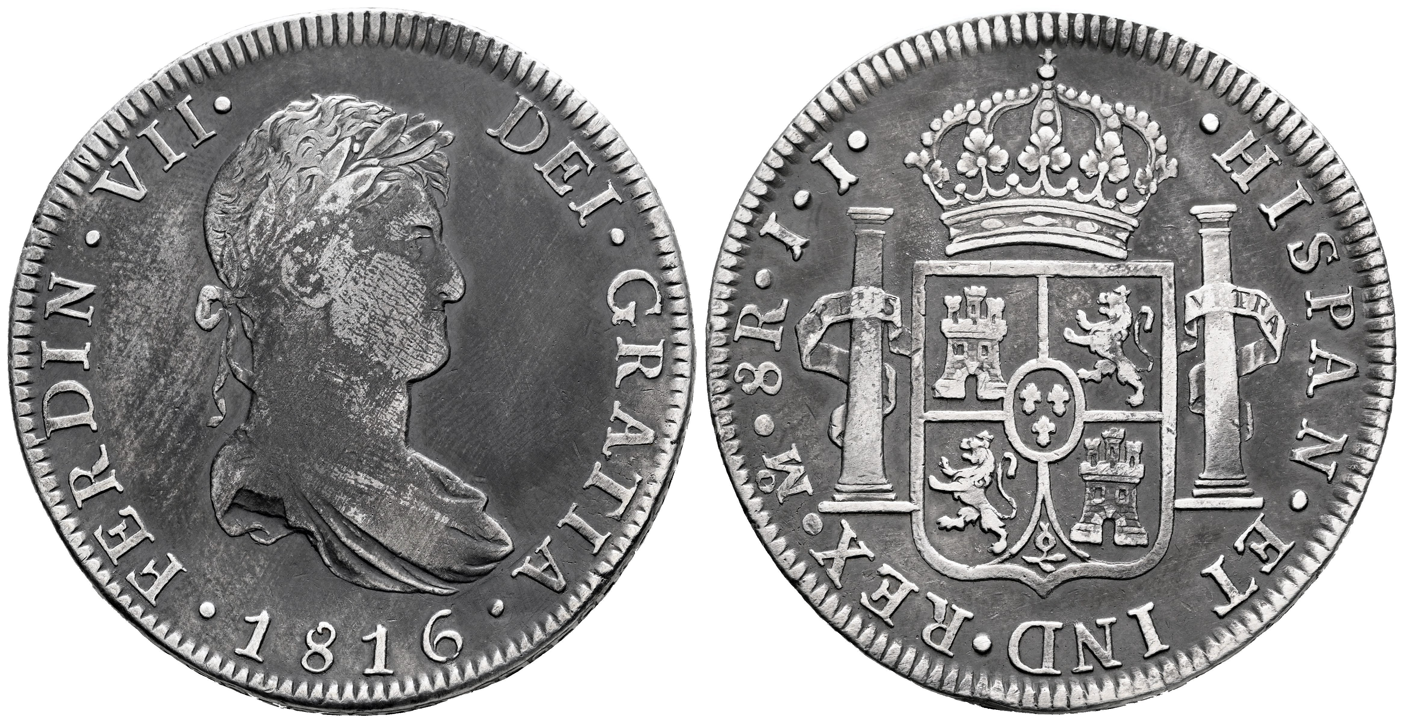 Ferdinand VII (1808-1833). 8 reales. 1816. Mexico. JJ. (Cal-1331). Ag. 26,78 g. Artificial patina. Cleaned. Choice VF. Est...120,00.