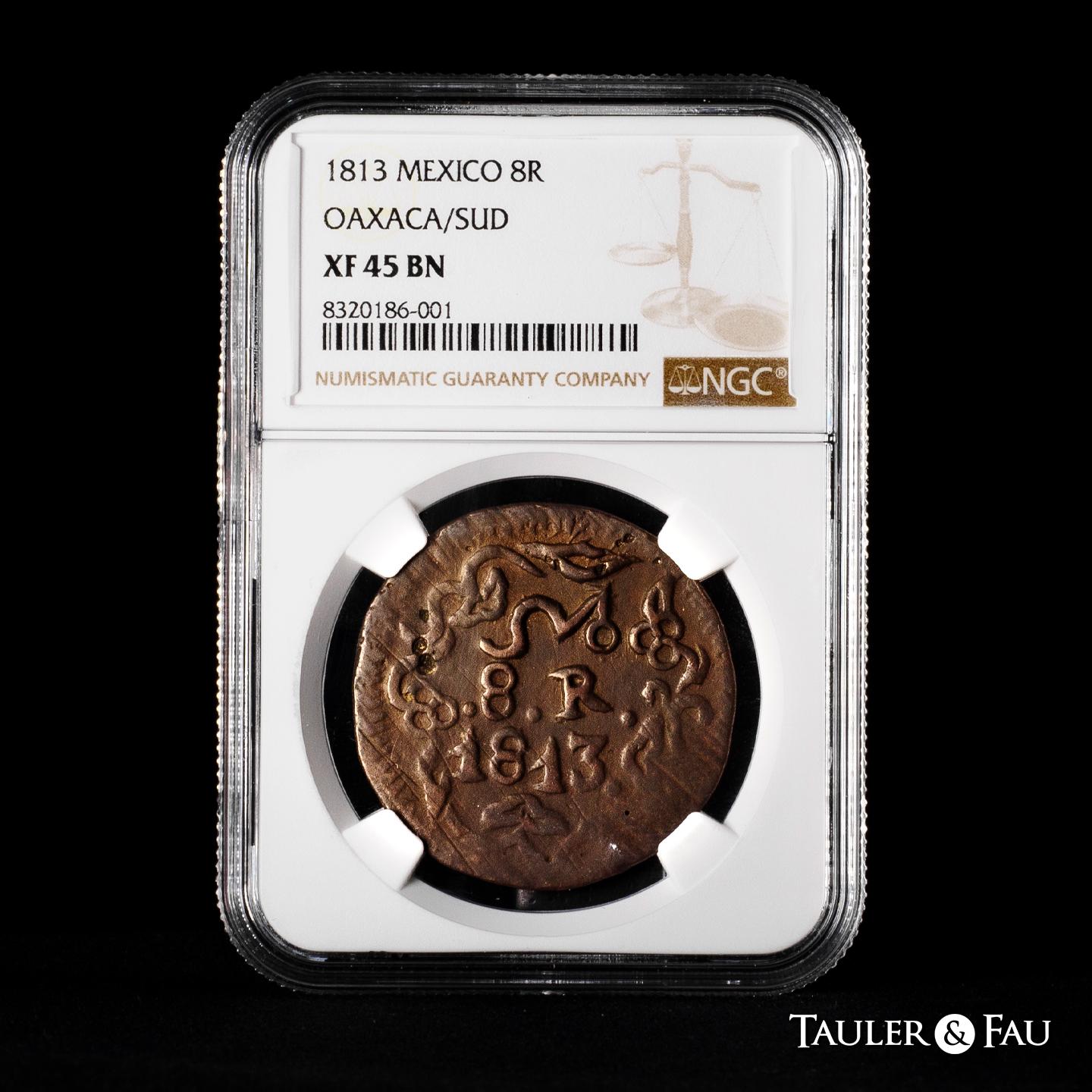 Ferdinand VII (1808-1833). 8 reales. 1813. Morelos. (Cal-1343). (Km-234). Ae. With ornaments. Number 3 straight and Arabic 1's. Dot after the date. Minimal setting stripes. Slabbed by NGC as XF 45 BN. Est...150,00.