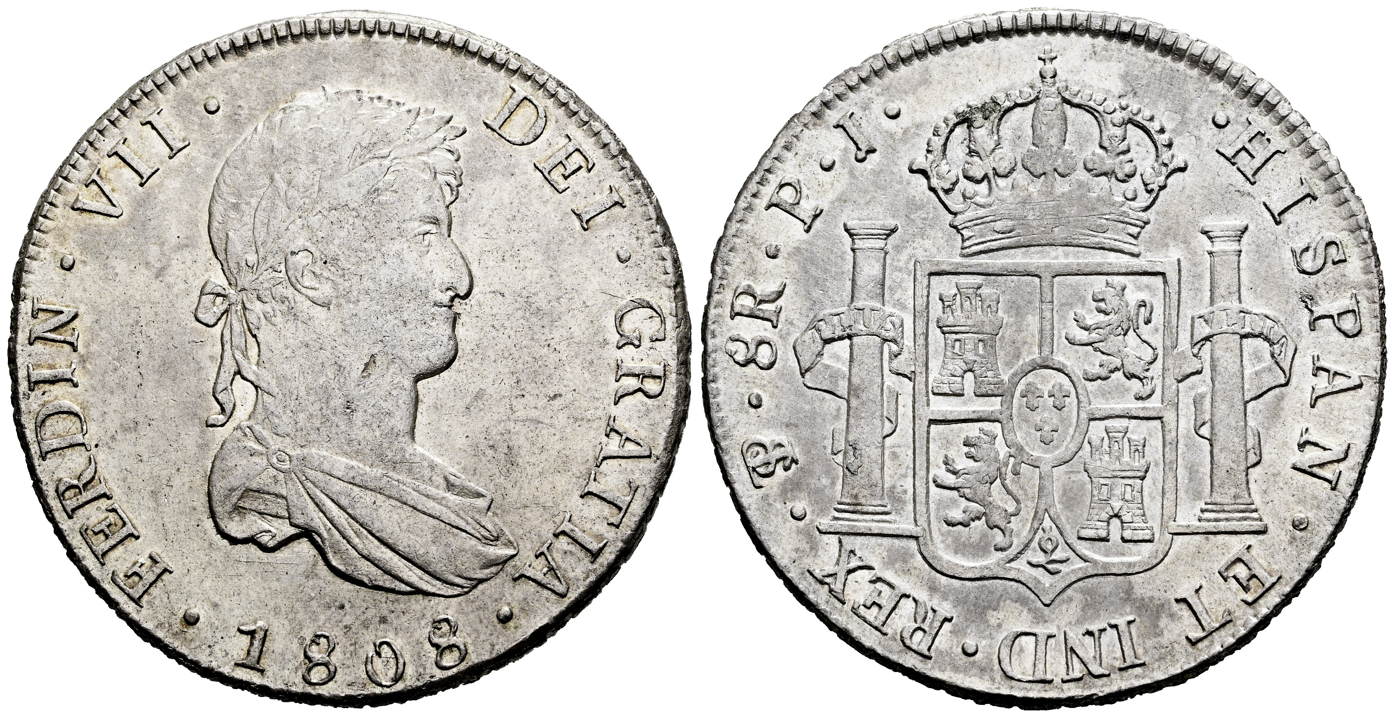 Ferdinand VII (1808-1833). 8 reales. 1808. Potosi. PJ. (Cal-1373). Ag. 26,92 g. First-year king´s bust. Soft tone. Almost XF. Est...150,00.