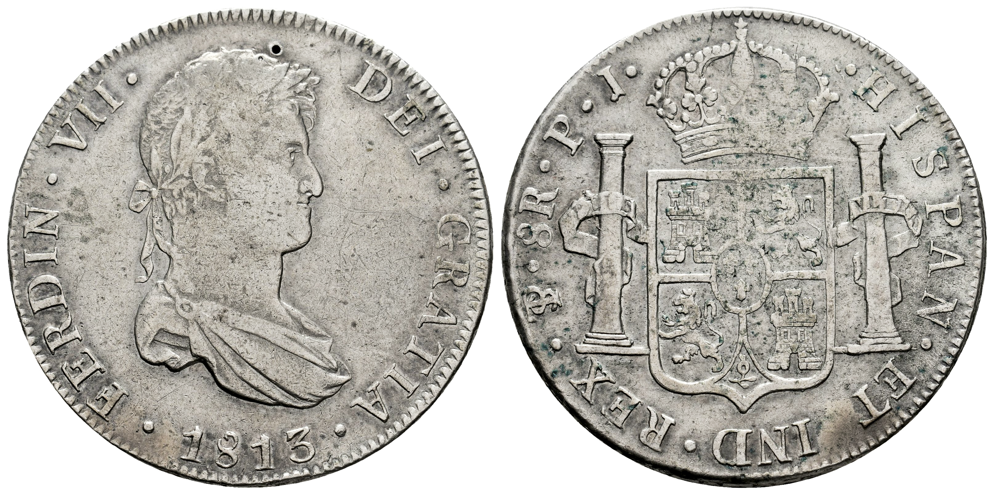 Ferdinand VII (1808-1833). 8 reales. 1813. Potosi. PJ. (Cal-1375). Ag. 26,78 g. Attempted piercing on obverse. Traces of verdigris. VF. Est...80,00.