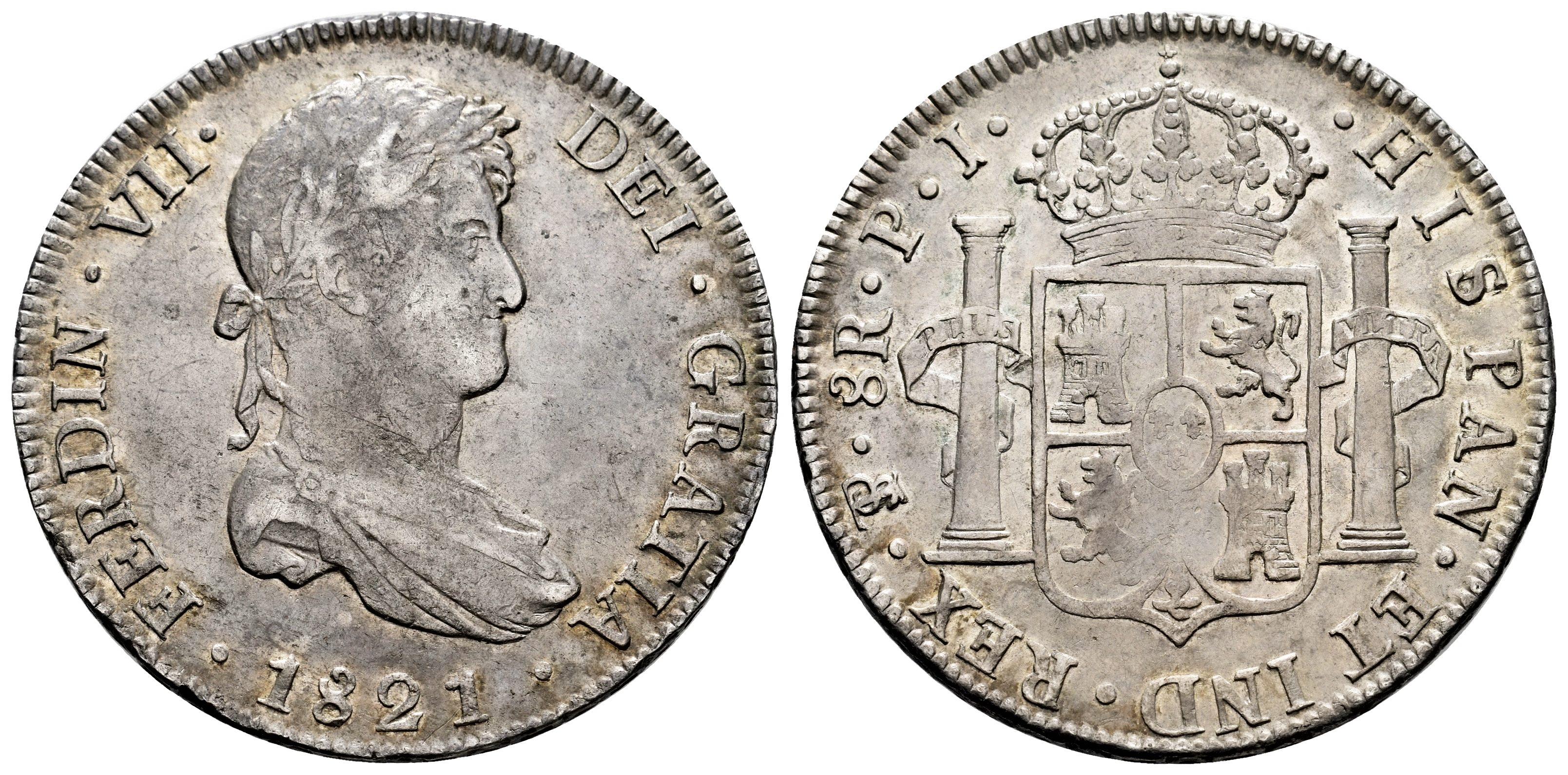 Ferdinand VII (1808-1833). 8 reales. 1821. Potosi. PJ. (Cal-1385). Ag. 26,91 g. Soft patina with small traces of luster. Choice VF. Est...150,00.