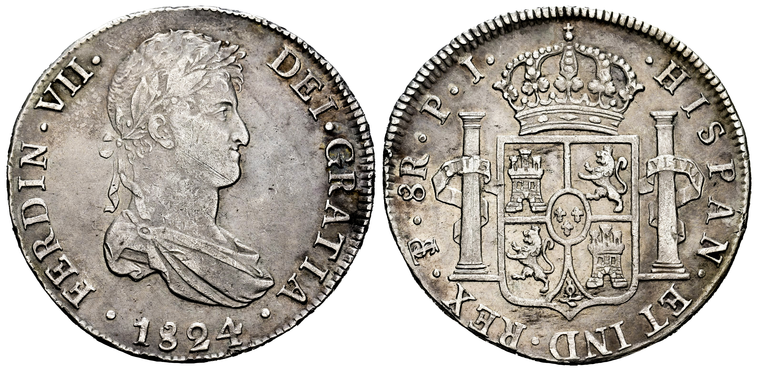 Ferdinand VII (1808-1833). 8 reales. 1824. Potosi. PJ. (Cal-1391). Ag. 26,96 g. Slight patina. Minor nick on edge. Choice VF. Est...220,00.