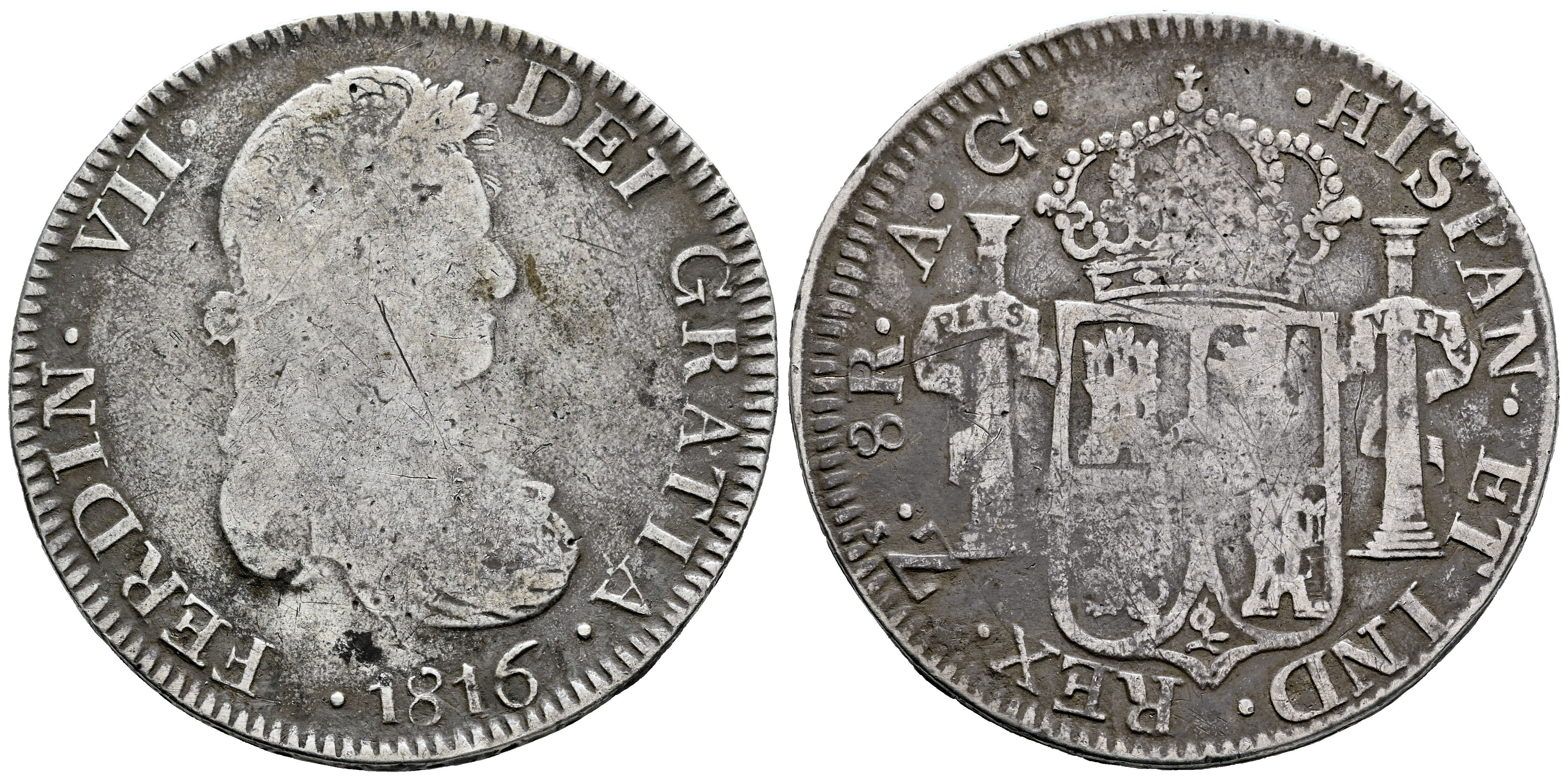Ferdinand VII (1808-1833). 8 reales. 1816. Zacatecas. AG. (Cal-1457). Ag. 25,13 g. Scarce. Choice F. Est...180,00.