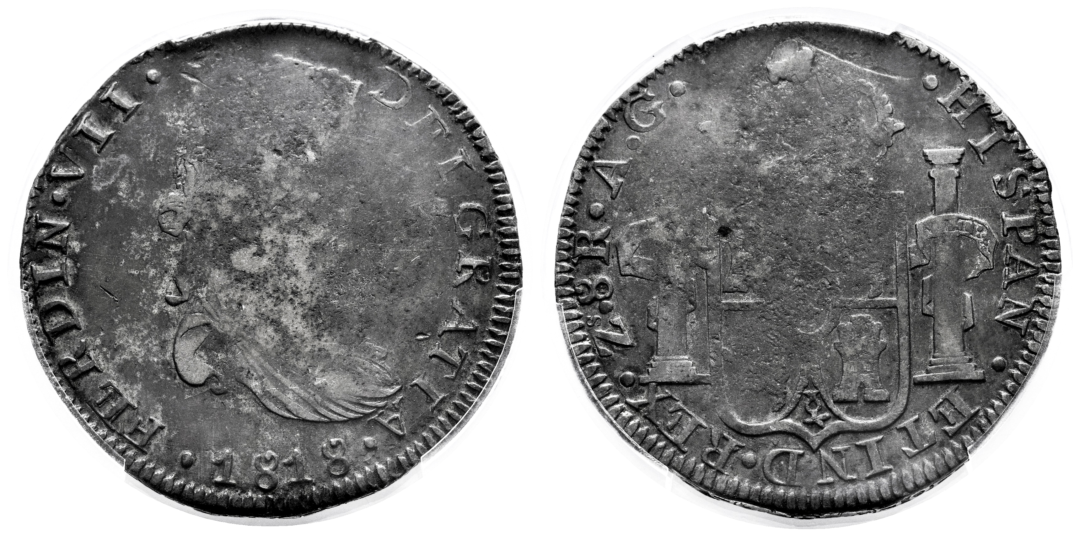 Ferdinand VII (1808-1833). 8 reales. 1818. Zacatecas. AG. (Cal-1459). (Ramírez-Z8.8.2). Ag. Patina. Scarce. Slabbed by PCGS as F 15. Est...200,00.