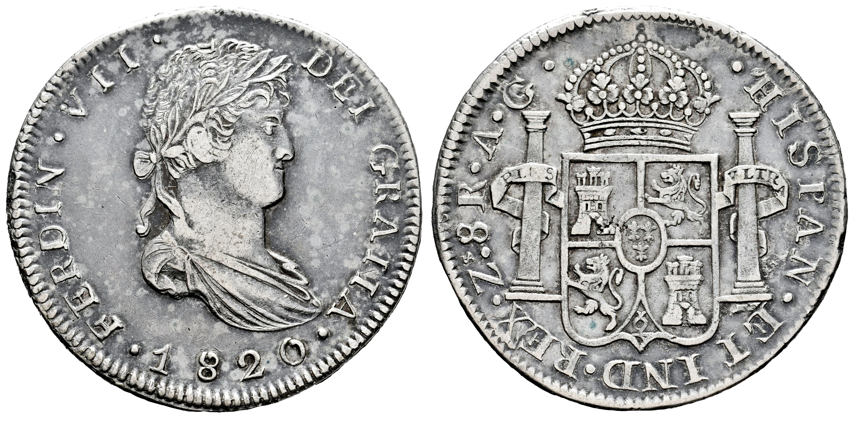 Ferdinand VII (1808-1833). 8 reales. 1820. Zacatecas. AG. (Cal-1463). Ag. 26,49 g. Cleaned. Scarce. Choice VF. Est...250,00.