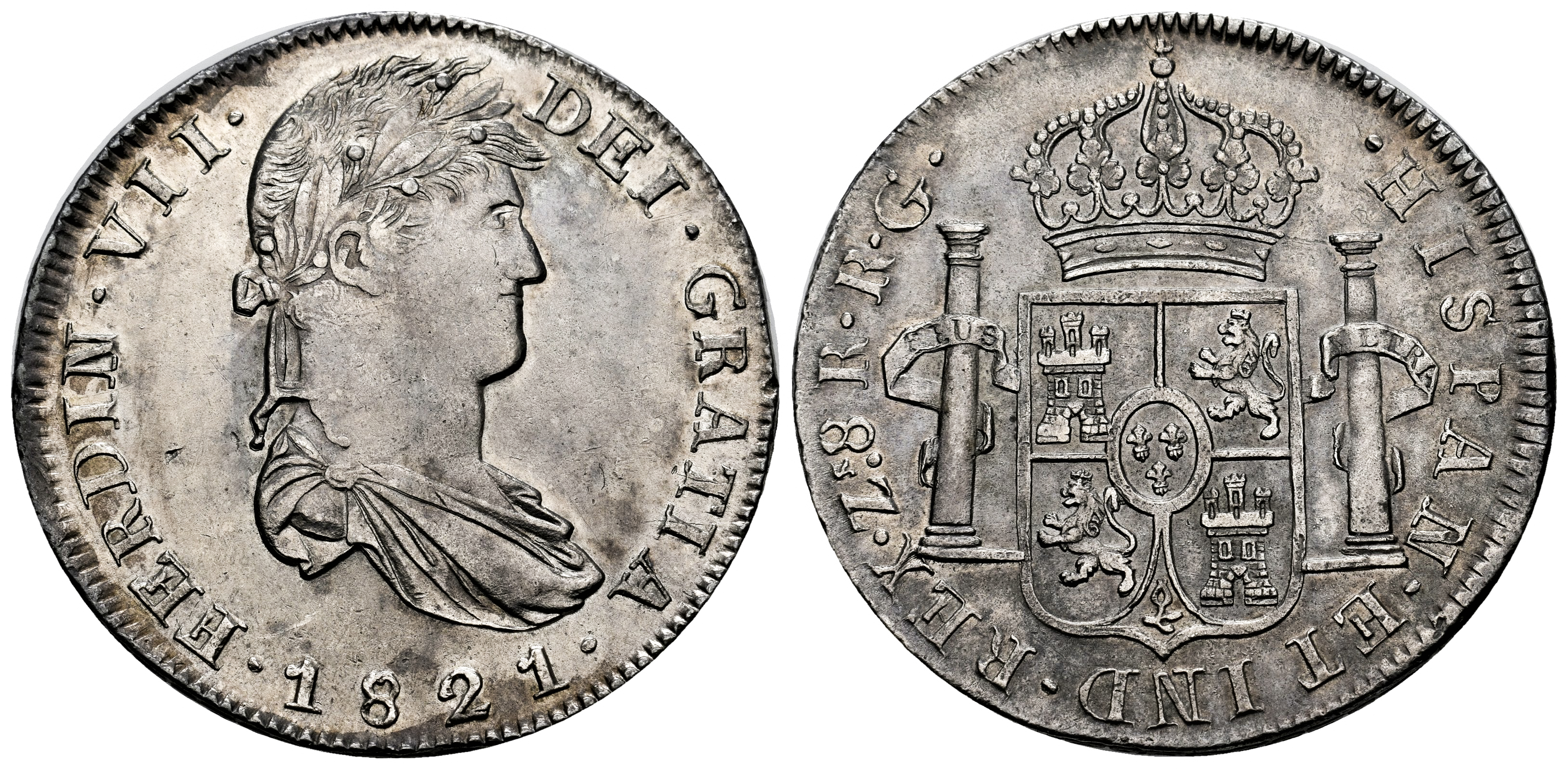 Ferdinand VII (1808-1833). 8 reales. 1821. Zacatecas. RG. (Cal-1465). Ag. 27,57 g. Lightly toned. Almost XF/XF. Est...300,00.