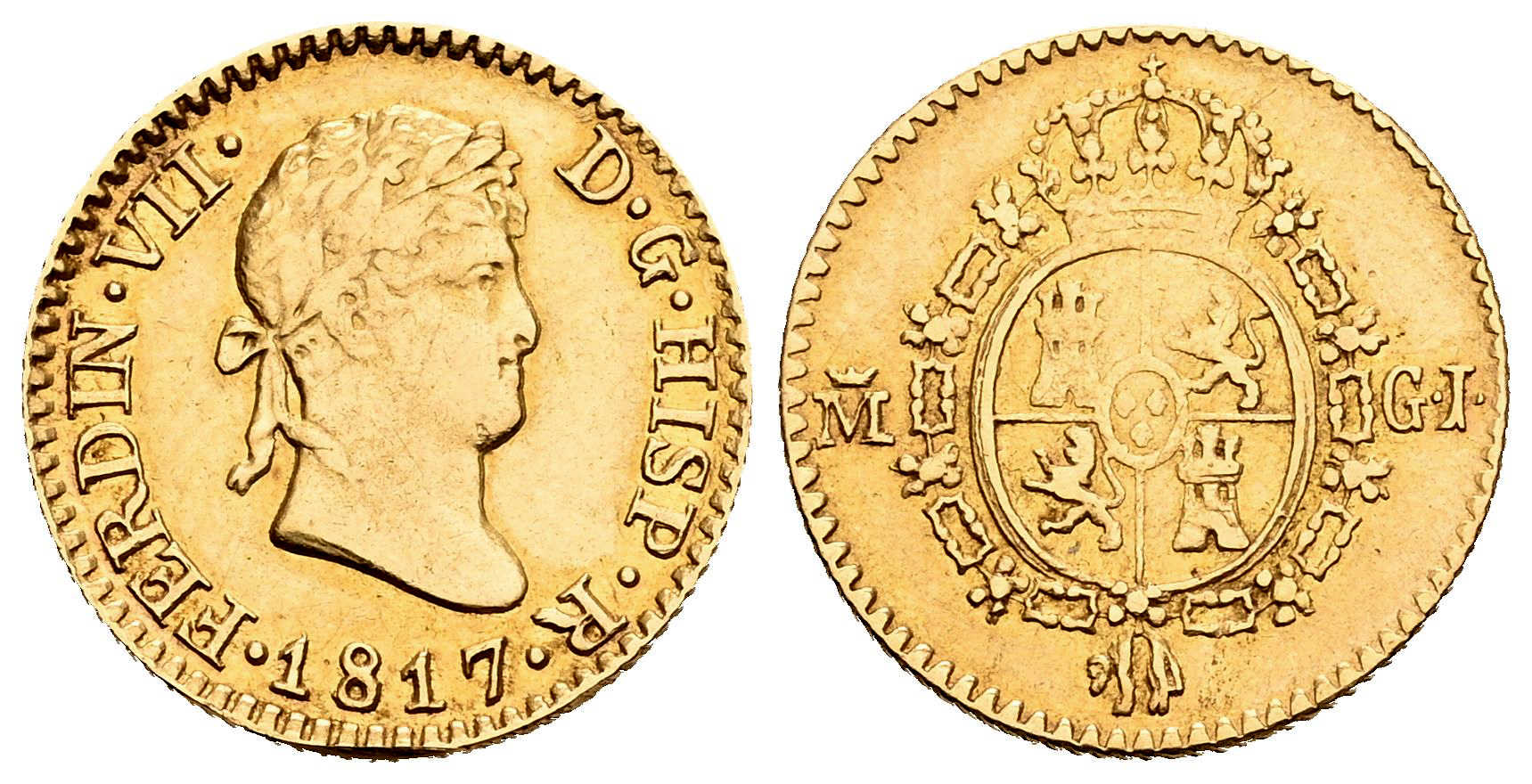 Ferdinand VII (1808-1833). 1/2 escudo. 1817. Madrid. GJ. (Cal-1486). Au. 1,72 g. Minor scratches on edge. Choice VF. Est...180,00.