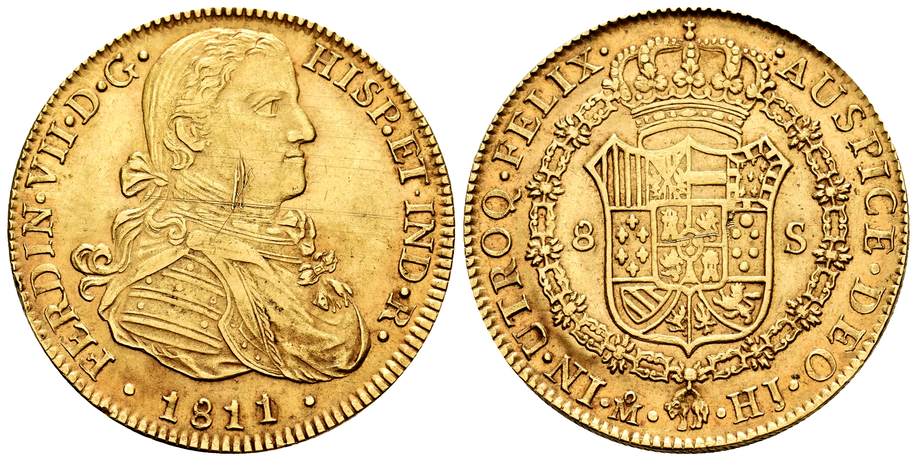 Ferdinand VII (1808-1833). 8 escudos. 1811. Mexico. HJ. (Cal-1785). Au. 27,08 g. Imaginary bust. Minimal adjustment lines on obverse. Scratches on the neck and small edge bumps. Very nice color. Almost XF. Est...3200,00.