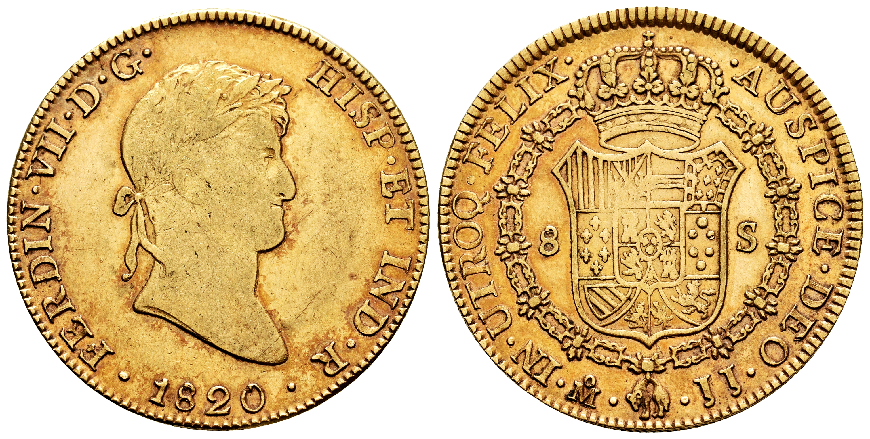 Ferdinand VII (1808-1833). 8 escudos. 1820. Mexico. JJ. (Cal-1799). (Cal onza-1271). Au. 27,05 g. Weak strike on obverse. Nice color. Choice VF. Est...2000,00.