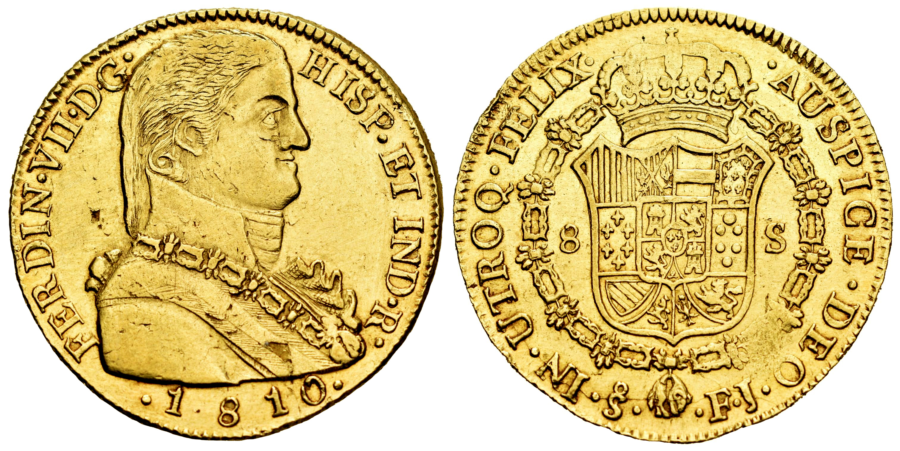 Ferdinand VII (1808-1833). 8 escudos. 1810. Santiago. FJ. (Cal-1863). (Cal onza-1346). Au. 26,81 g. Admiral bust. It retains some original luster on reverse. Rubbed. Attractive. Rare. Almost XF. Est...3800,00.