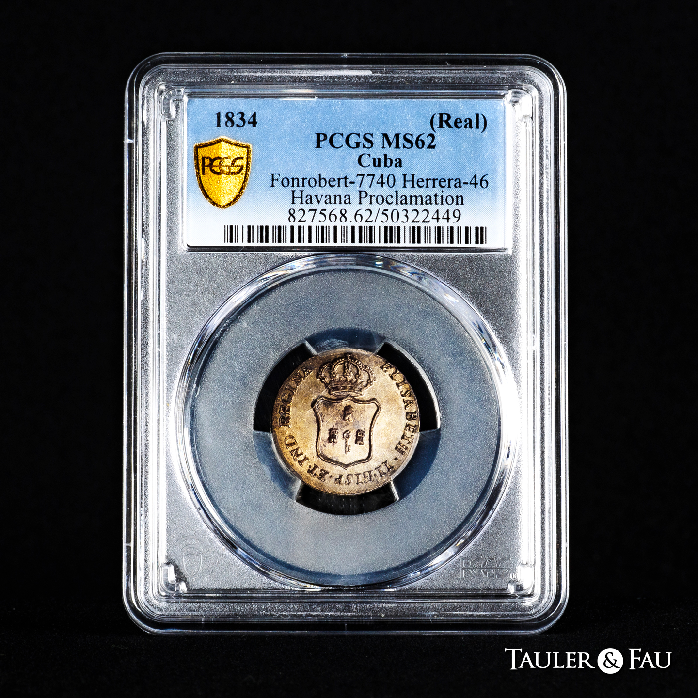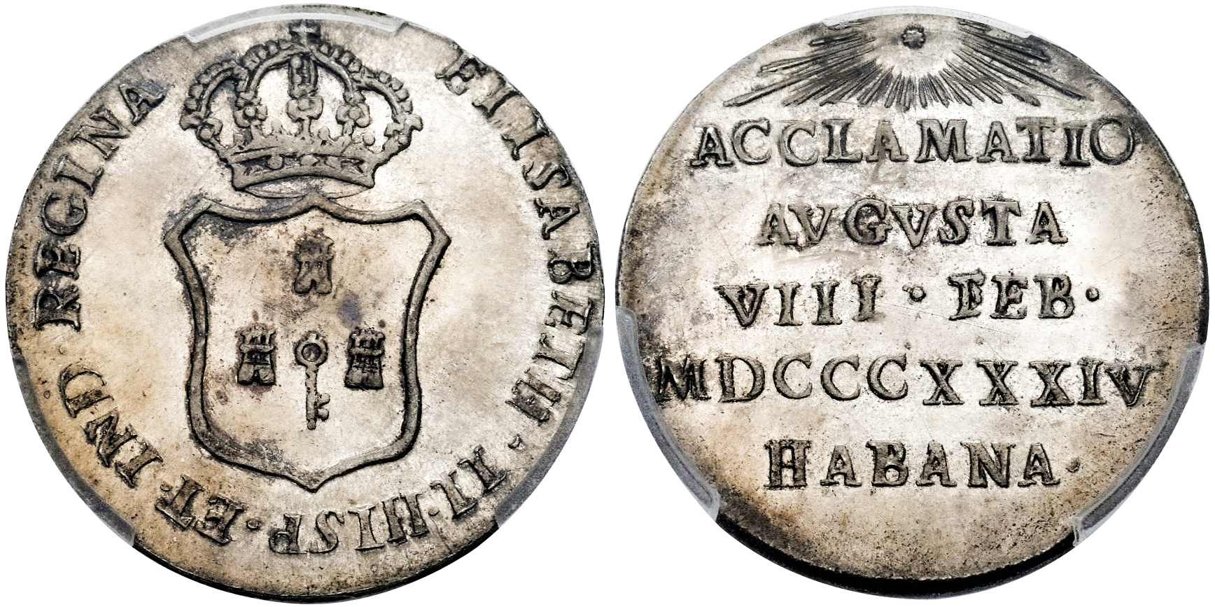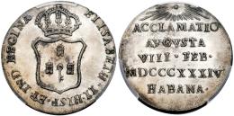 Elizabeth II (1833-1868). "Proclamation" medal. 1834. La Habana. (Fonrobert-7740). (Herrera-46). Ag. 1 real module. Rare in this grade. Slabbed by PCGS as MS 62. Only 1 finer specimen in the PCGS census. Est...300,00.