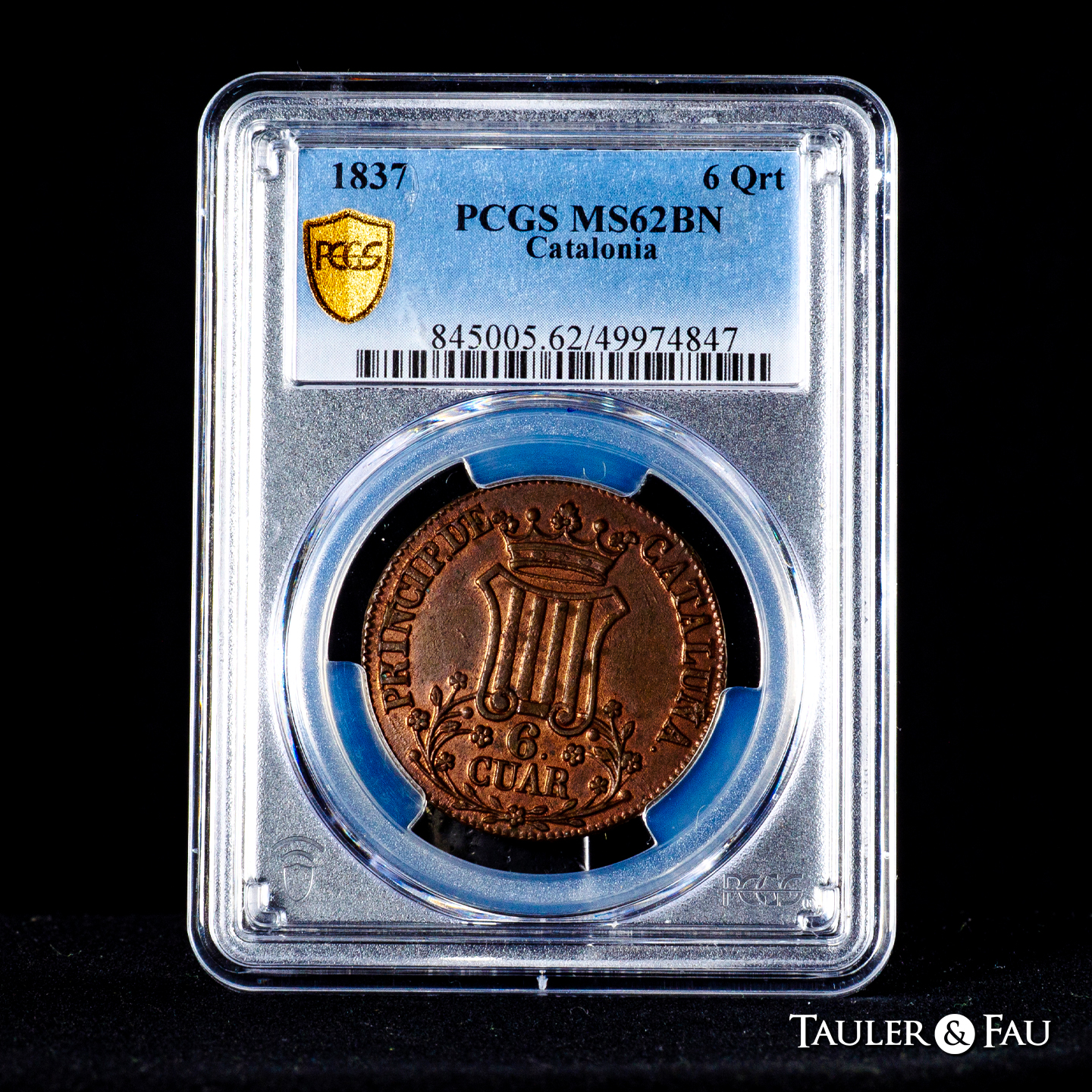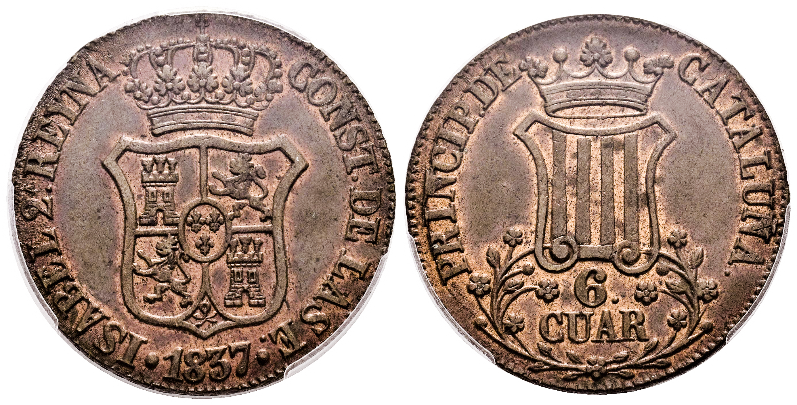 Elizabeth II (1833-1868). 6 quartos. 1837. Barcelona. (Cal-17). Ae. Original luster. Slabbed by PCGS as MS 62 BN. (Top Pop), the finest known in the PCGS census. Est...300,00.