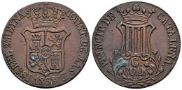 Elizabeth II (1833-1868). 6 quartos. 1837. Barcelona. (Cal-18). Ae. 13,58 g. It retains some verdigris. Choice VF. Est...50,00.