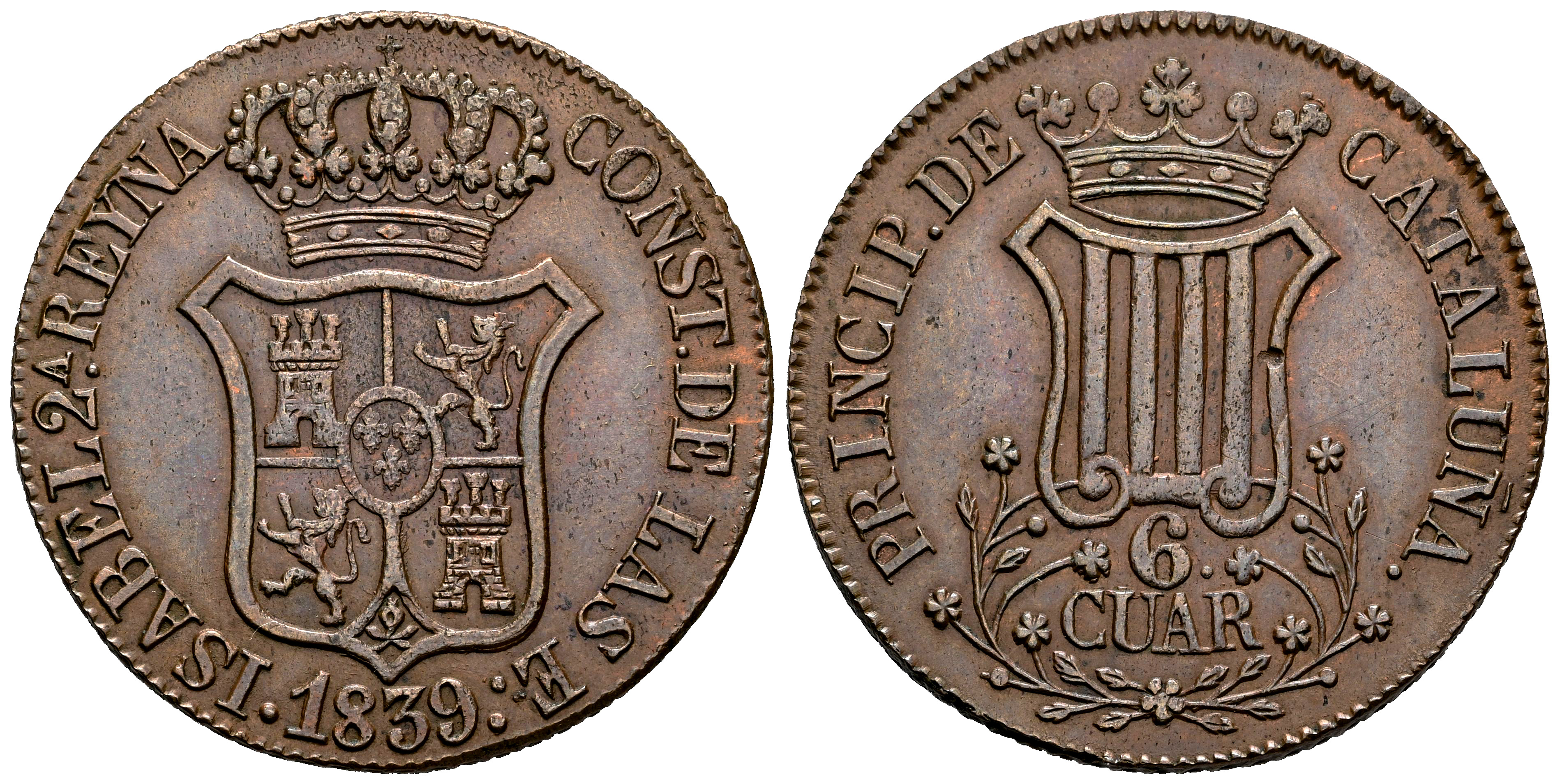Elizabeth II (1833-1868). 6 quartos. 1839. Barcelona. (Cal-20). Ae. 12,76 g. Almost XF. Est...70,00.