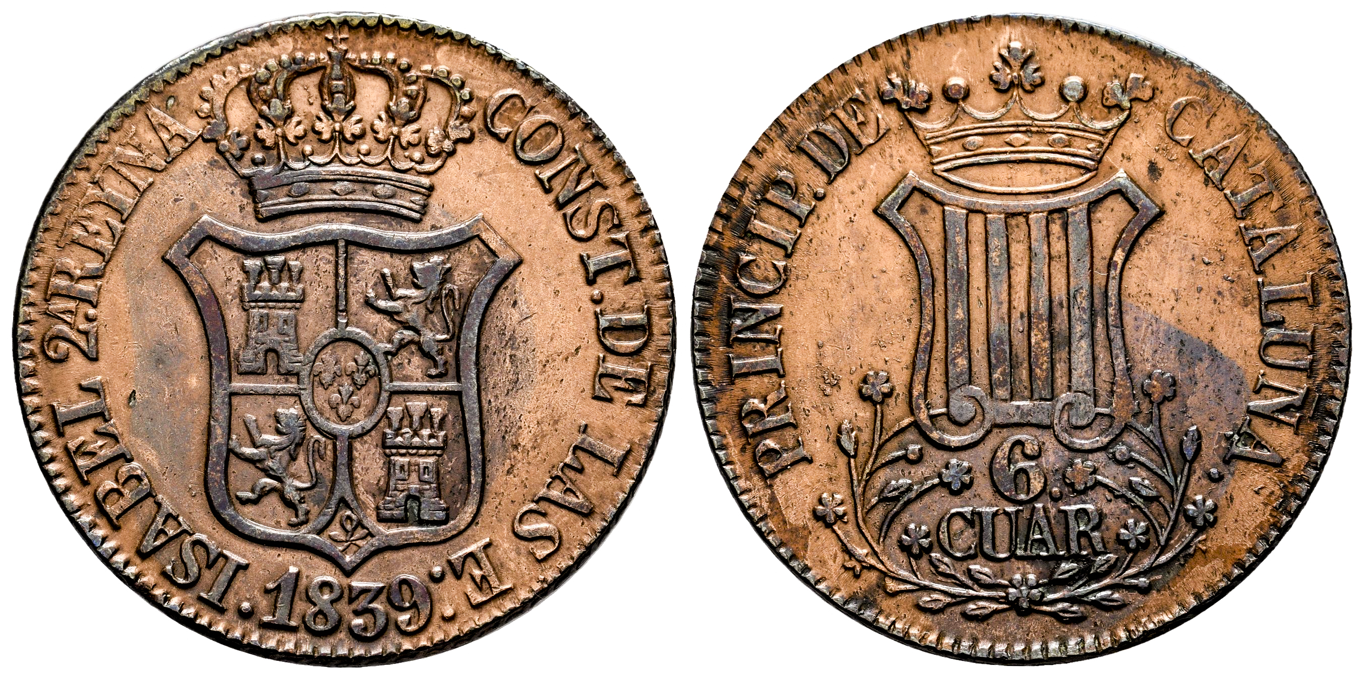 Elizabeth II (1833-1868). 6 quartos. 1839. Barcelona. (Cal-20). Ae. 13,36 g. Cleaned. VF. Est...30,00.