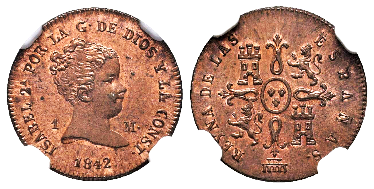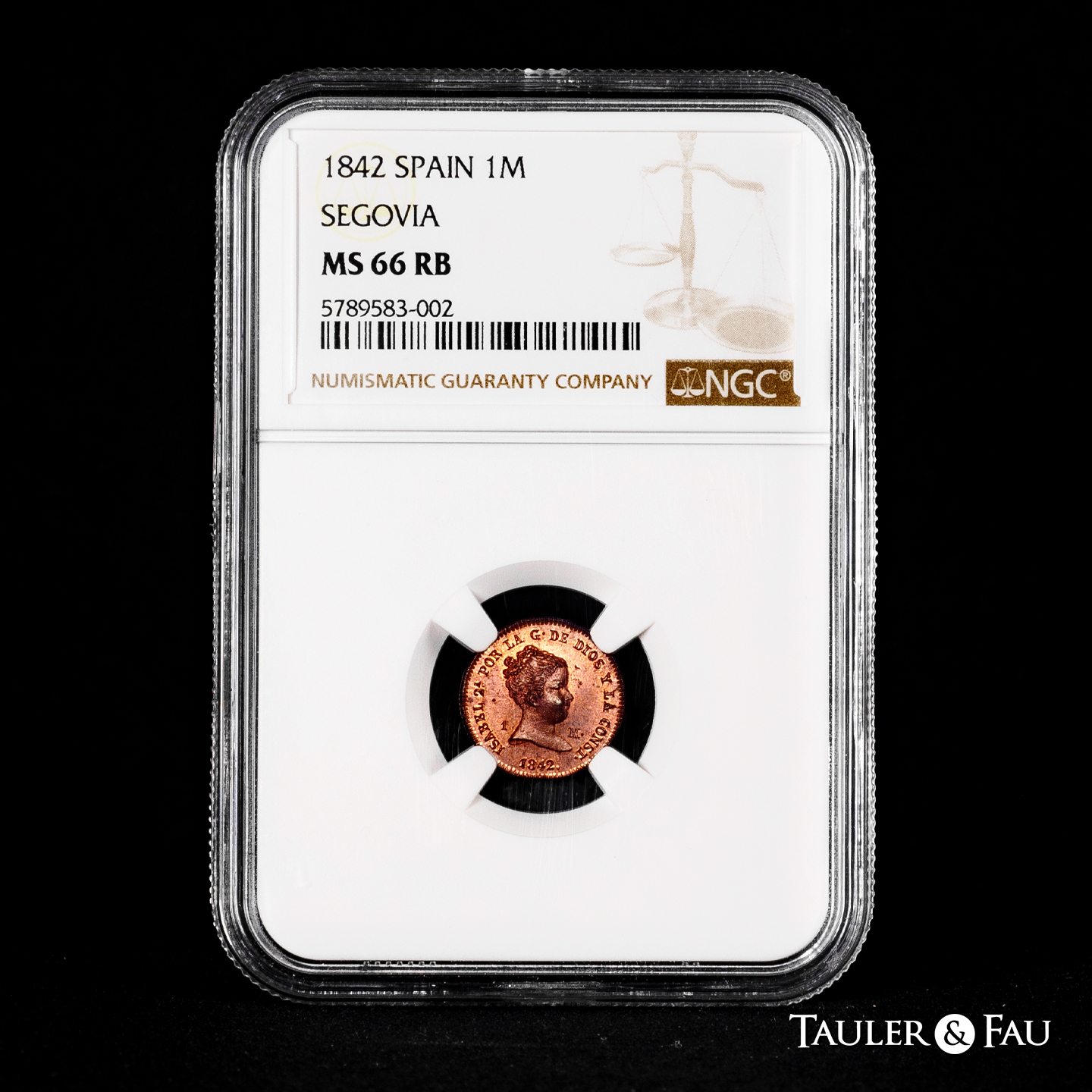 Elizabeth II (1833-1868). 1 maravedi. 1842. Segovia. (Cal-35). Ae. Magnificent piece. Full luster and nice color. Very rare in this grade. Slabbed by NGC as MS 66 RB (Top Pop), the finest known in the NGC and PCGS census. Est...400,00.