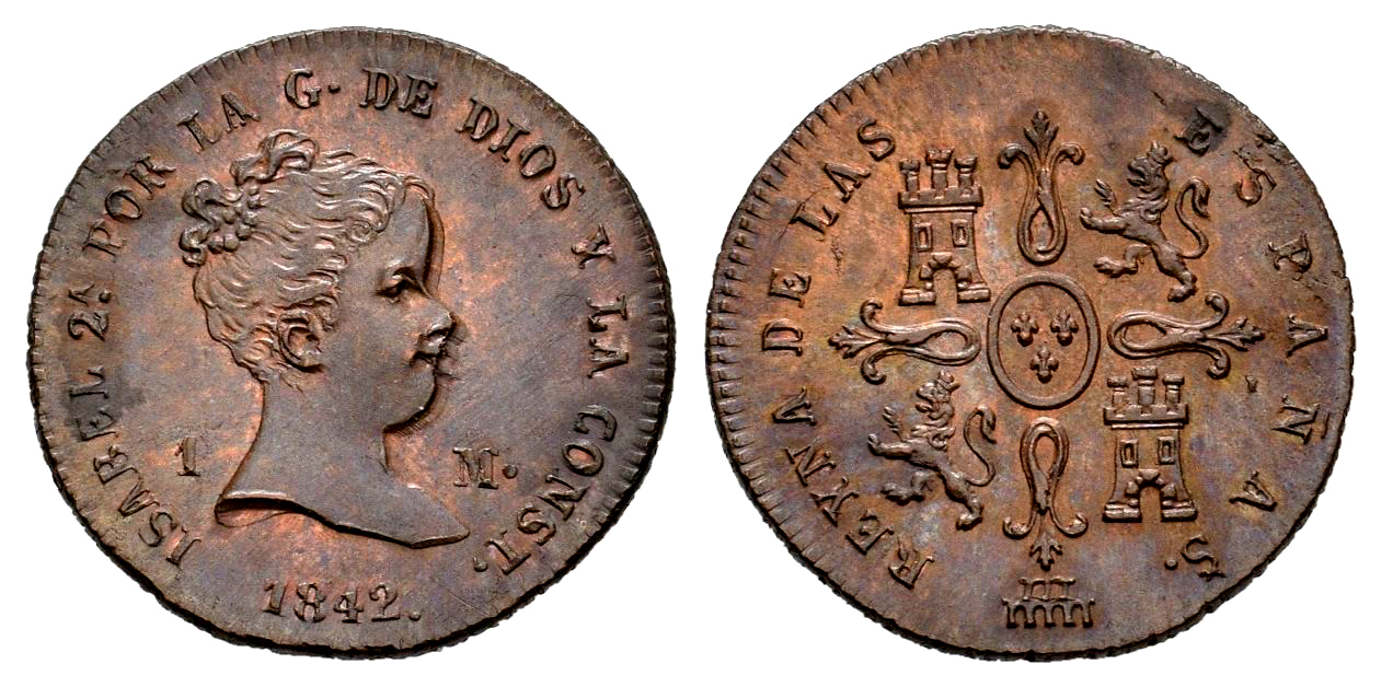 Elizabeth II (1833-1868). 1 maravedi. 1842. Segovia. (Cal-35). Ae. Nice color. Traces of luster. AU. Est...200,00.