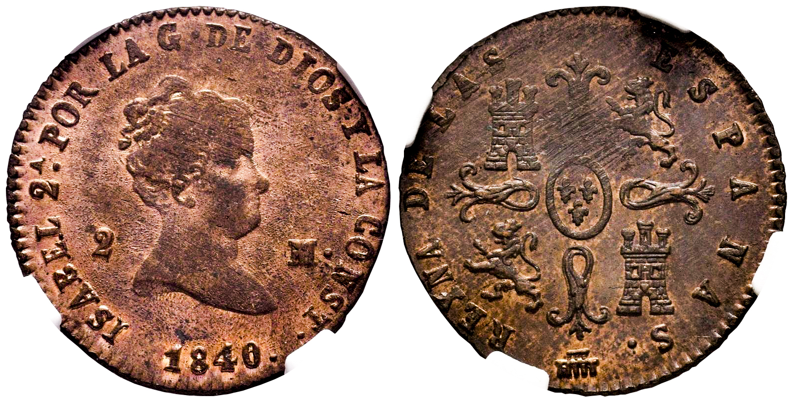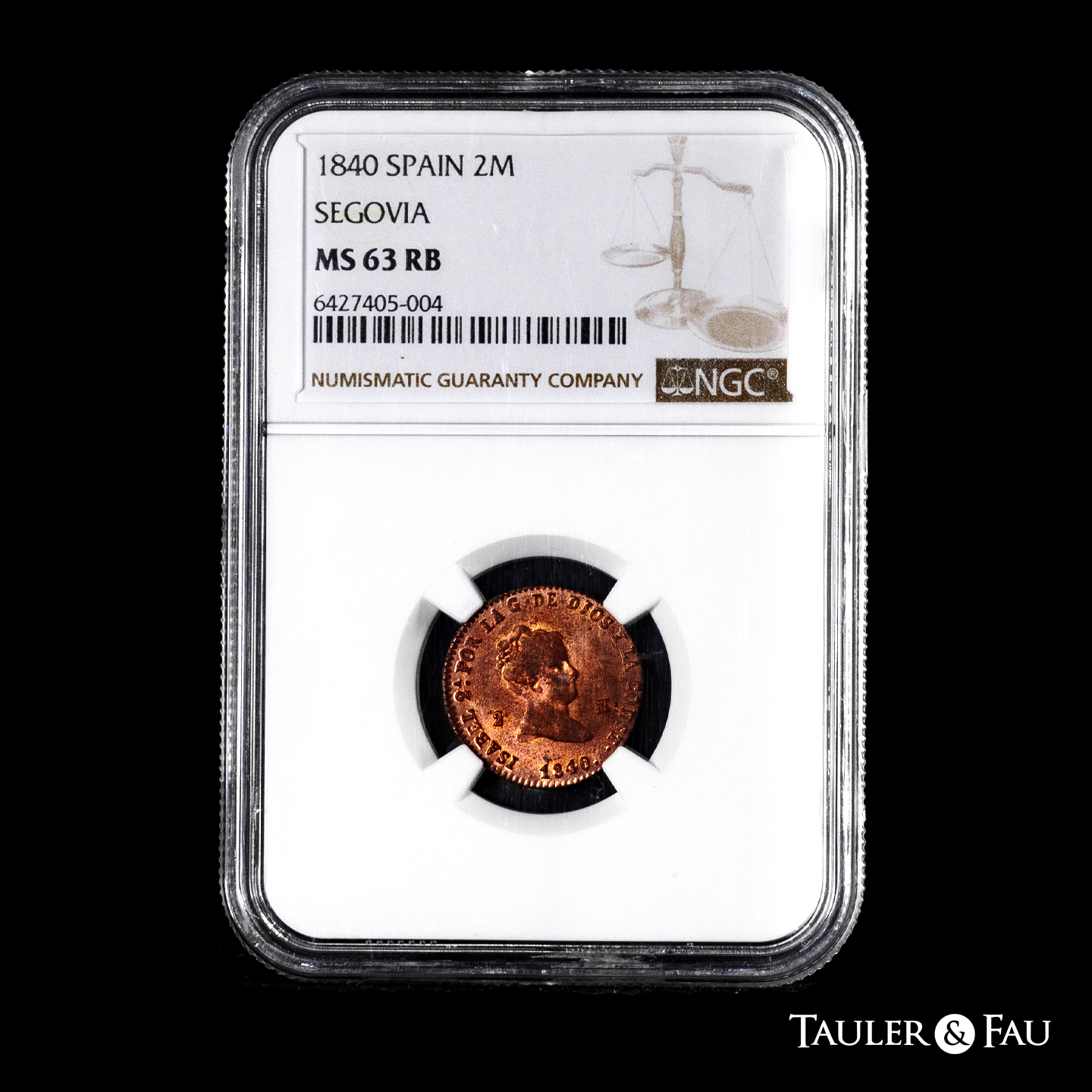 Elizabeth II (1833-1868). 2 maravedis. 1840. Segovia. (Cal-51). Ae. Original luster. Nice color. Slabbed by NGC as MS 63 RB. Est...120,00.