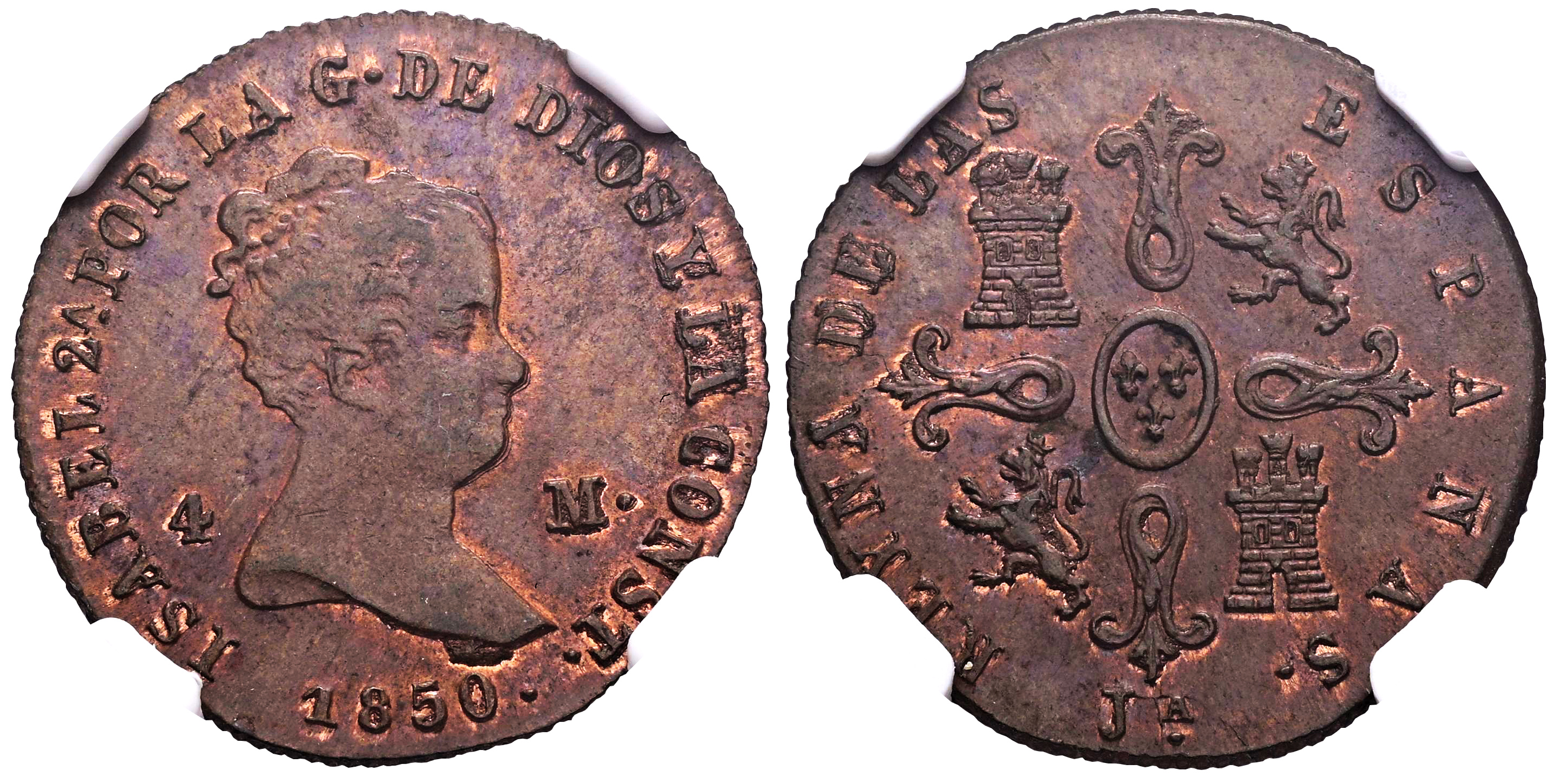 Elizabeth II (1833-1868). 4 maravedis. 1850. Jubia. (Cal-76). Ae. Traces of luster. Slabbed by NGC as MS 63 BN. Only 1 finer specimen in the NGC census. Est...200,00.