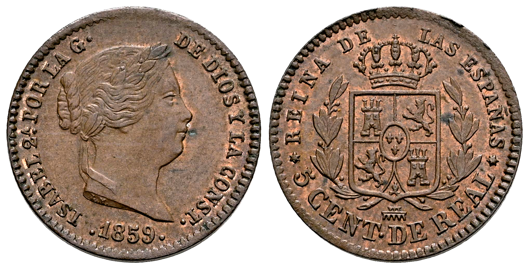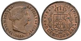 Elizabeth II (1833-1868). 5 centimos de real. 1859. Segovia. (Cal-164). Ae. 1,67 g. Slight traces of original luster. XF. Est...60,00.