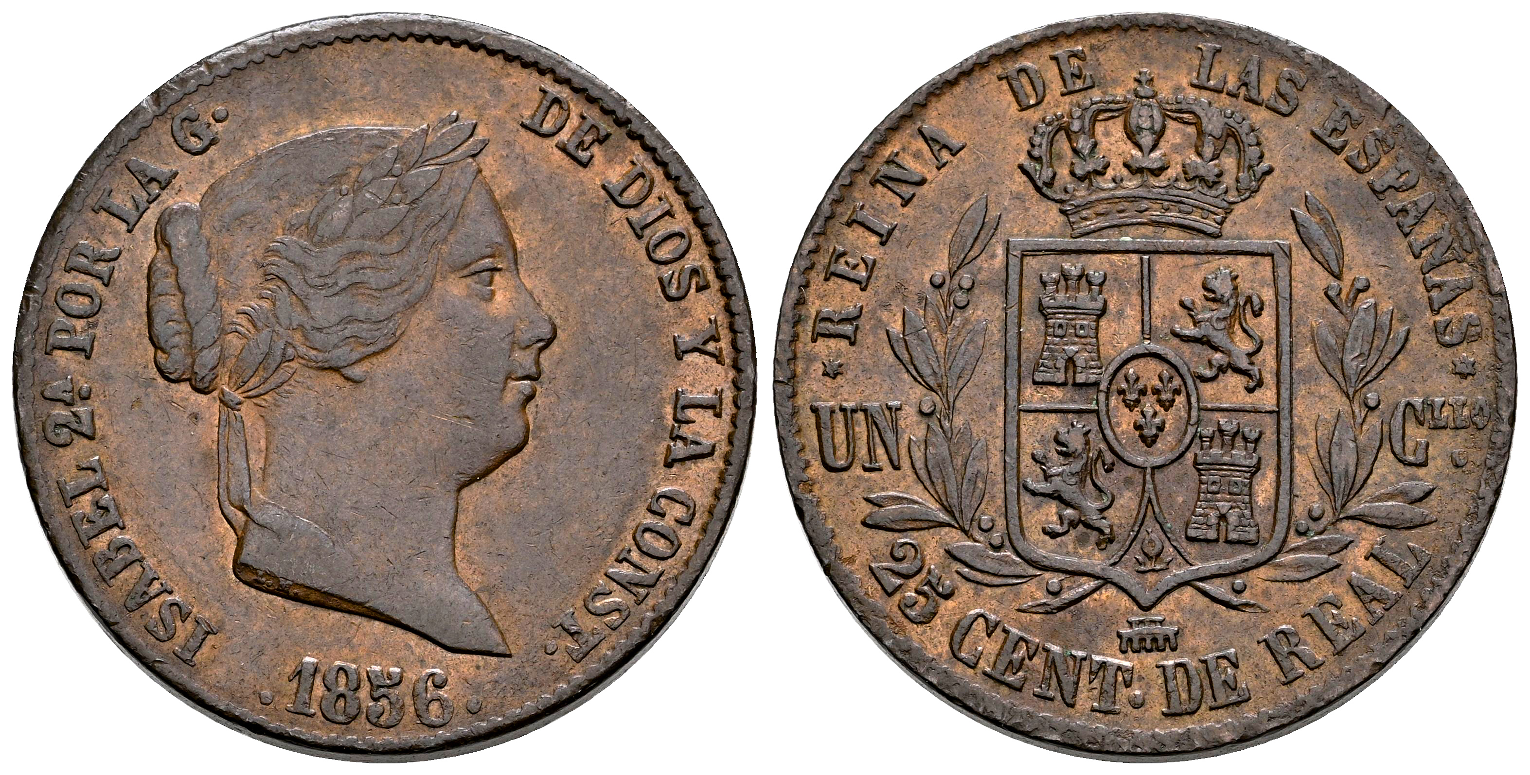 Elizabeth II (1833-1868). 25 centimos de real. 1856. Segovia. (Cal-189). Ae. 9,43 g. Choice VF. Est...45,00.